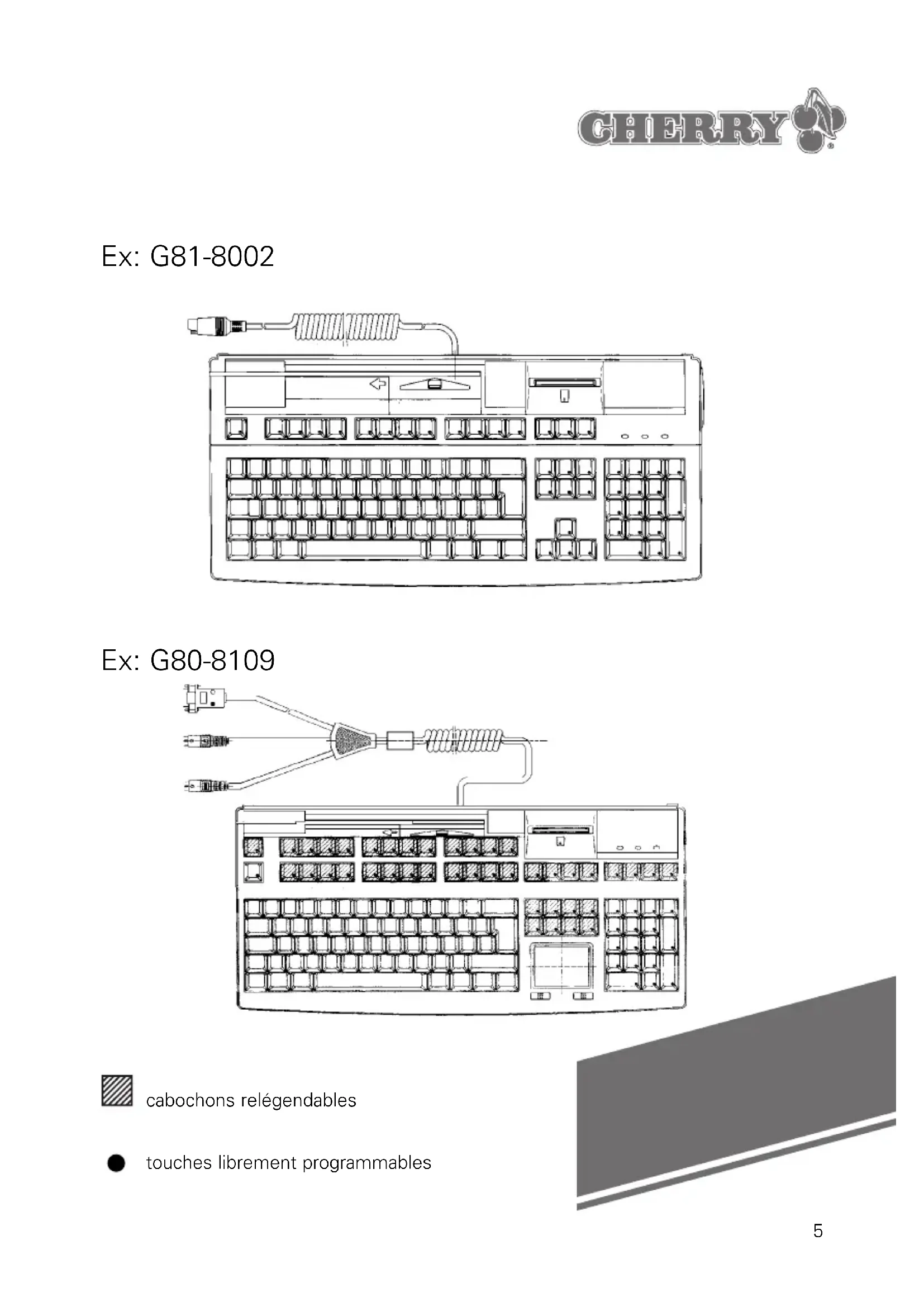 Les périphériques de saisie Cherry se distinguent par leur qualité supérieure et leur sécurité. Conçus avant tout pour la saisie et la rédaction professionnelles, les claviers Cherry satisfont à toutes les normes dominantes du marché ainsi qu’aux exigences de l’ergonomie. Ils offrent une technique éprouvée, innovante, d’un grand confort, pour des applications réussies en bureautique et en informatique. Applications de ce manuel Ce manuel s’applique aux claviers des séries 7000 et 8000 G 80 ainsi qu’ au G 81-8308. Les claviers ainsi présentés montrent le positionnement des touches librement programmables avec leurs différents dispositifs de lecteur de carte intégré, qui différent selon les modéles. Exemples de présentations:4 cabochons relégendables touches librement programmables Ex: G81-7002 Ex: G80-70095 cabochons relégendables touches librement programmables Ex: G80-8109 Ex: G81-80026 cabochons relégendables touches librement programmables Ex: G81-8308 Ex: G80-82027