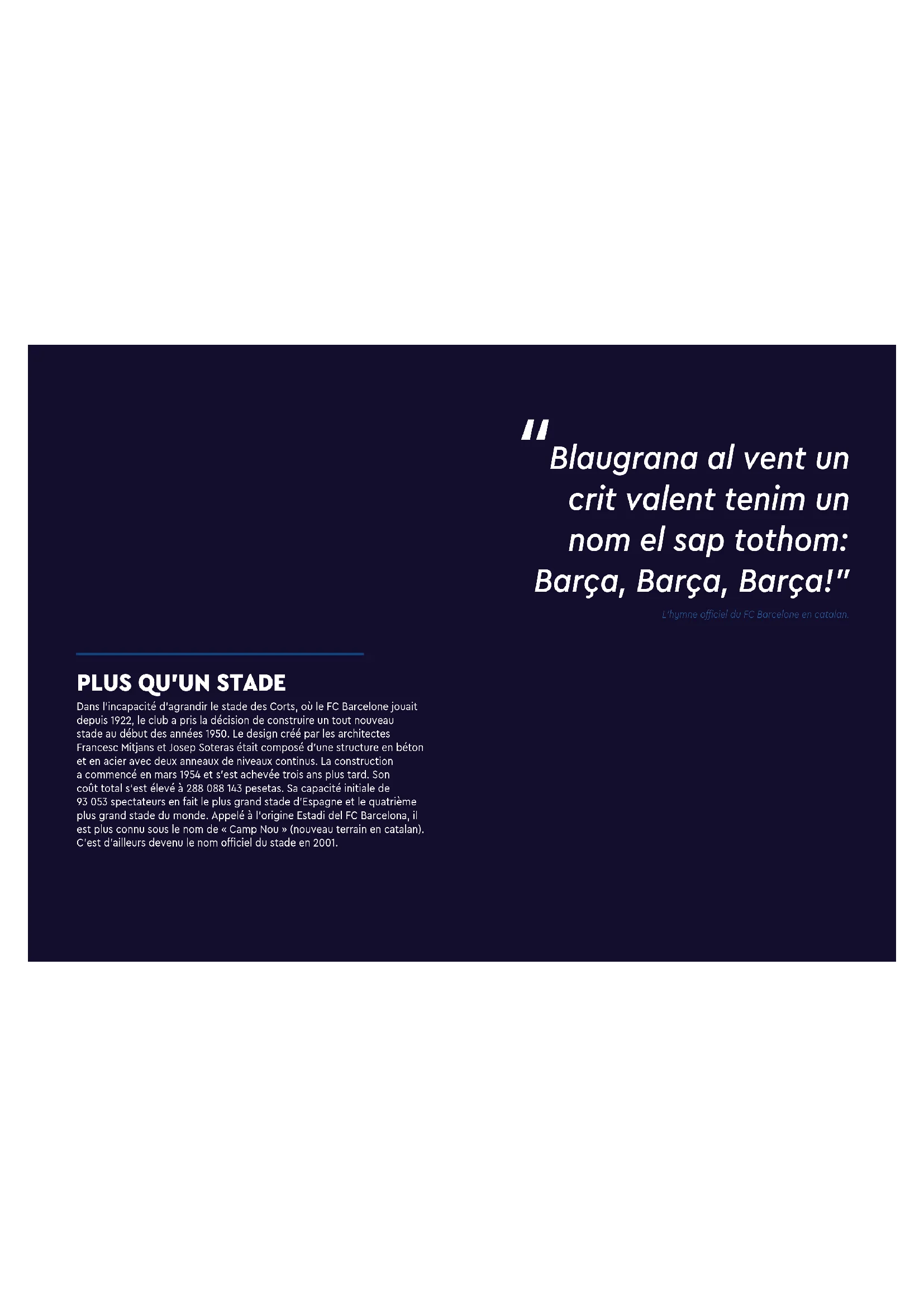 F C B A R C E L O N A L I V R E T 1«MÉS QUE UN CLUB» En entrant dans l’impressionnant stade du Camp Nou, vous remarquerez immédiatement l’immense inscription «Més Que Un Club» qui orne les sièges de la tribune Est. À la fois devise et mantra pour le FCBarcelone, «Plus qu’un club» rappelle constamment l’identité et la raison d’être du club. L’objectif premier du club fondé en 1899 était de créer une organisation dirigée par ses membres, fortement ancrée dans la culture catalane et prônant des valeurs telles que l’humilité, l’effort, l’ambition, le travail d’équipe et le respect. Le FCBarcelone est une institution footballistique unique, avec un stade iconique et de fidèles supporters dans le monde entier. «Nous sommes plus qu’une équipe de grandes stars, nous sommes plus qu’un stade plein de rêves, nous sommes plus que les buts que nous avons marqués et plus que les trophées que nous avons remportés tout au long de notre histoire.» FCBarcelonaPLUS QU’UN STADE Dans l’incapacité d’agrandir le stade des Corts, où le FC Barcelone jouait depuis 1922, le club a pris la décision de construire un tout nouveau stade au début des années 1950. Le design créé par les architectes FrancescMitjans et Josep Soteras était composé d’une structure en béton et en acier avec deux anneaux de niveaux continus. La construction a commencé en mars1954 et s’est achevée trois ans plus tard. Son coût total s’est élevé à 288088143pesetas. Sa capacité initiale de 93053spectateurs en fait le plus grand stade d’Espagne et le quatrième plus grand stade du monde. Appelé à l’origine Estadi del FC Barcelona, il est plus connu sous le nom de «Camp Nou» (nouveau terrain en catalan). C’est d’ailleurs devenu le nom officiel du stade en 2001. L’hymne officiel du FCBarcelone en catalan. “Blaugrana al vent un crit valent tenim un nom el sap tothom: Barça, Barça, Barça!”ANC1–564-N-2446
