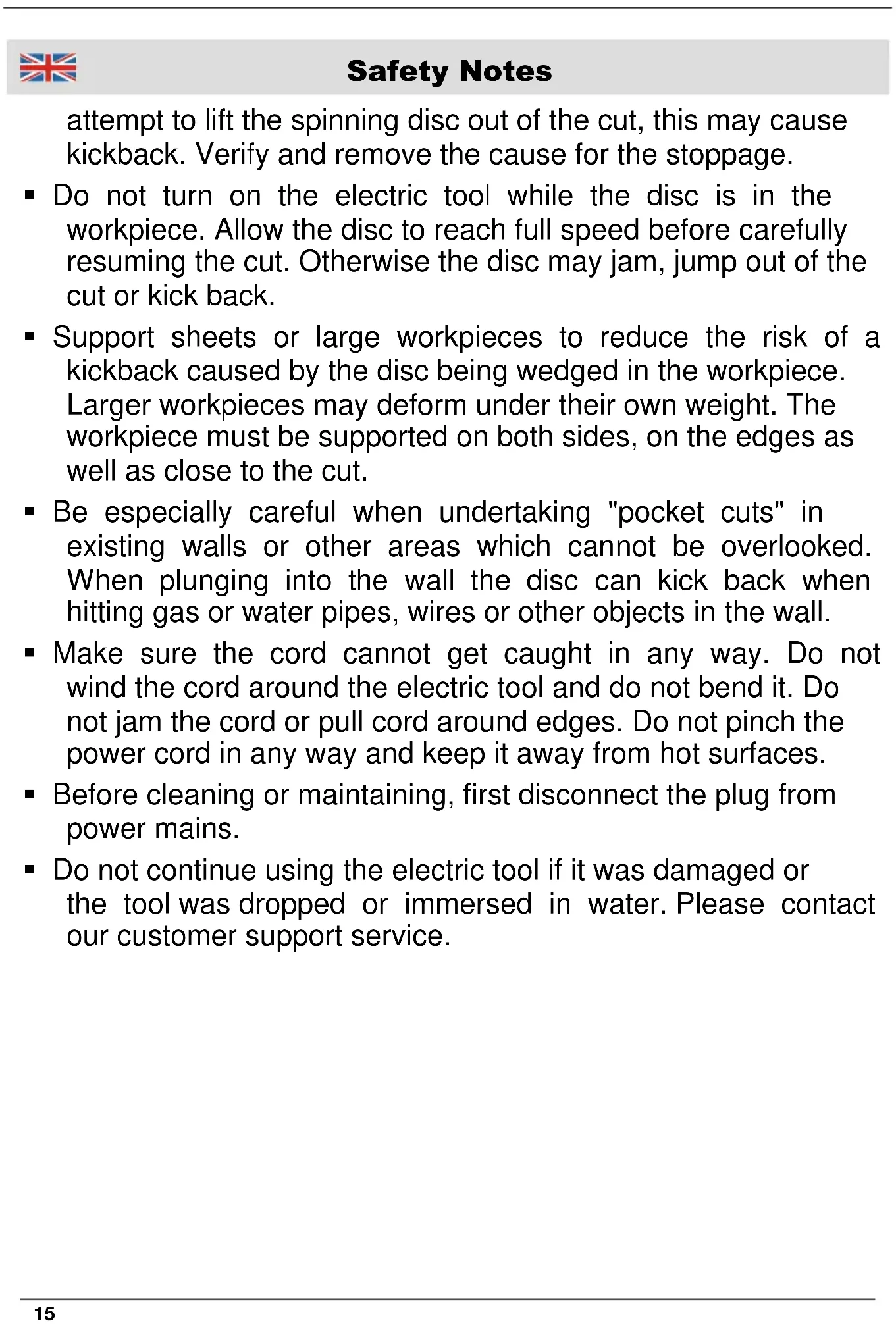 retour de bâton dans le cas de l'outil de puissance avec un disque tournant jette livrés directement chez vous. Si la lame ou confitures arrêter de travailler, éteignez l'appareil et maintenez-le tranquille jusqu'à ce que le disque s'est arrêté. Ne jamais essayer de tirer la lame encore en cours de l'intersection, ou peut être un revers. Identifier et corriger la cause du brouillage. Tournez sur l'outil de puissance encore, tant qu'il est dans la pièce. Laissez la lame jusqu'à sa pleine vitesse avant de continuer avec la section attentivement. Sinon, le disque peut se coincer, sauter hors de la pièce ou une cause de non- retour. Panneaux de soutien ou de pièces de grandes dimensions à partir afin de réduire le risque d'un retour de bâton par une lame coincée. Grandes pièces peuvent se plier sous leur propre poids. La pièce doit être pris en charge sur les deux côtés, et deux dans le voisinage de la section de séparation et sur le bord. Méfiez-vous particulièrement des «coupés de poche» dans les murs existants ou d'autres zones non visibles. La lame de coupe immergé dans peut provoquer des conduites de gaz ou d'eau, fils électriques ou d'autres objets un revers. Assurez-vous que le cordon d'alimentation peut se faire prendre n'importe où. Ne pliez pas le cordon d'alimentation et de l'enrouler autour de l'unité non. Débranchez le câble n'importe où, et vous ne serrez les coins. Gardez loin des surfaces chaudes et vives. Lors du nettoyage, lorsqu'il n'est pas utilisé et l'entretien à l'unité hors tension et débranchez-le de l'alimentation. Ne pas utiliser l'appareil s'il ne fonctionne pas correctement ou s'il a été endommagé par une chute. Démonter l'appareil et que vous n'essayez pas de réparer. S'il vous plaît contacter le support client.23