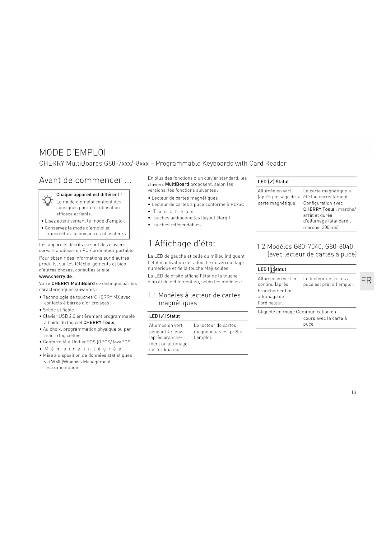 OPERATING MANUAL CHERRY MultiBoards G80-7xxx/-8xxx – Programmable Keyboards with Card Reader EN13 Avant de commencer ... Les appareils décrits ici sont des claviers servant à utiliser un PC / ordinateur portable. Pour obtenir des informations sur d'autres produits, sur les téléchargements et bien d'autres choses, consultez le site www.cherry.de. Votre CHERRY MultiBoard se distingue par les caractéristiques suivantes :