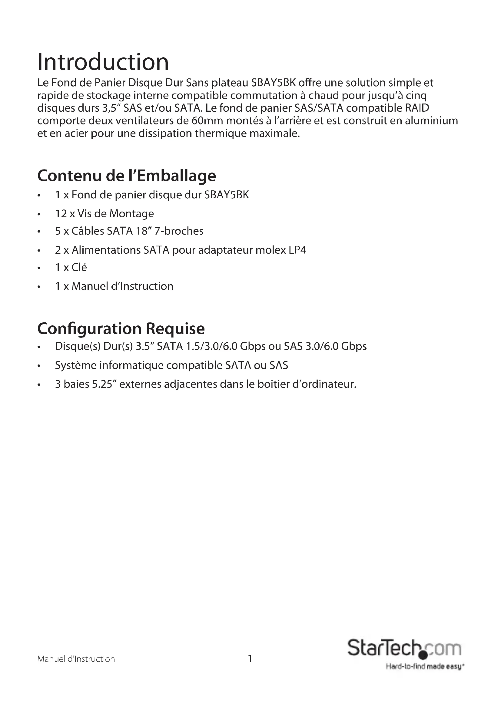 Introduction Le Fond de Panier Disque Dur Sans plateau SBAY5BK ore une solution simple et rapide de stockage interne compatible commutation à chaud pour jusqu’à cinq disques durs 3,5“ SAS et/ou SATA. Le fond de panier SAS/SATA compatible RAID comporte deux ventilateurs de 60mm montés à l’arrière et est construit en aluminium et en acier pour une dissipation thermique maximale. Contenu de l’Emballage