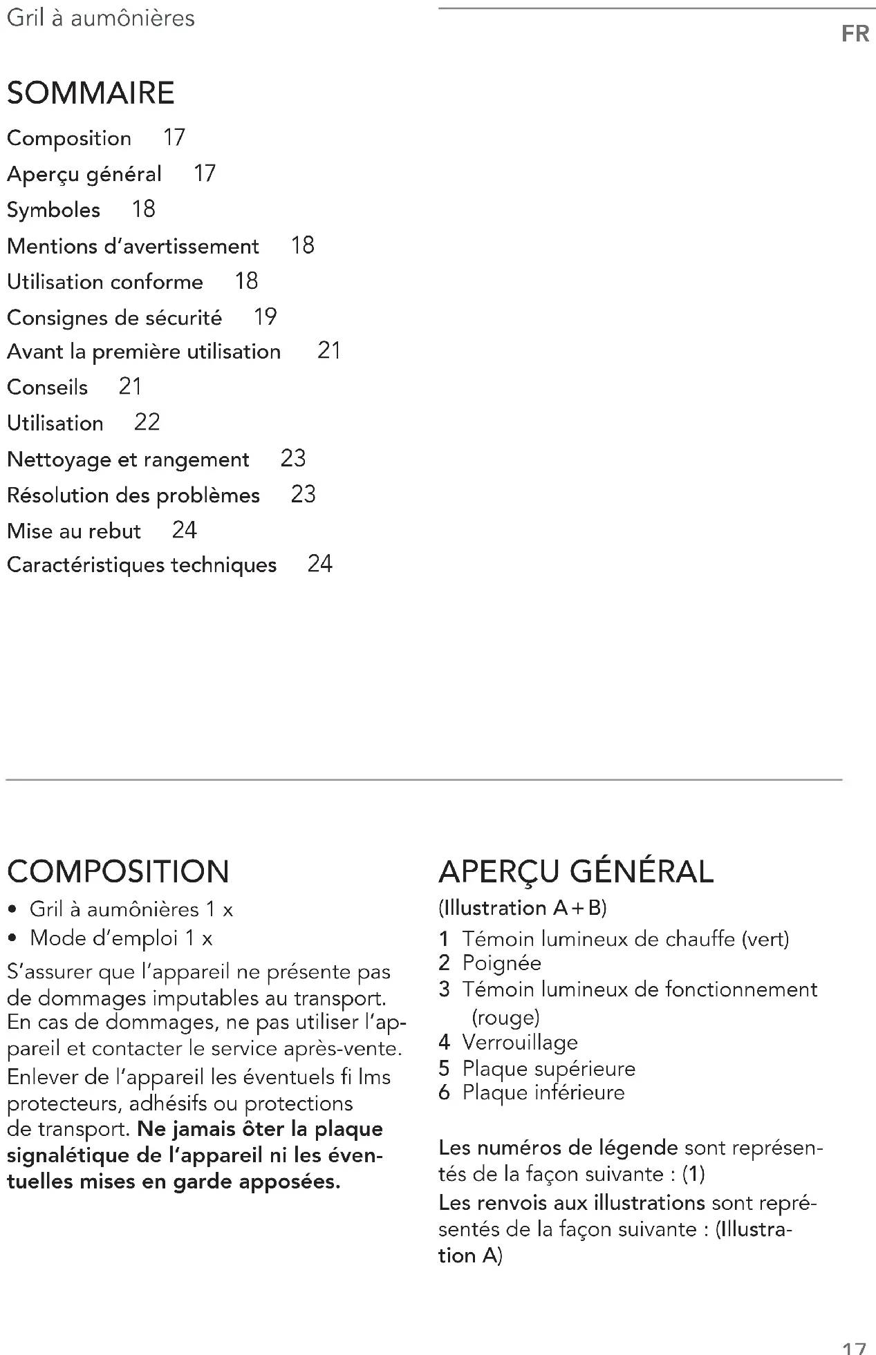(IllustrationA + B) 1 Témoin lumineux de chauffe (vert) 2 Poignée 3 Témoin lumineux de fonctionnement (rouge) 4 Verrouillage 5 Plaque supérieure 6 Plaque inférieure Les numéros de légende sont représen- tés de la façon suivante: (1) Les renvois aux illustrations sont repré- sentés de la façon suivante: (Illustra- tionA)FR