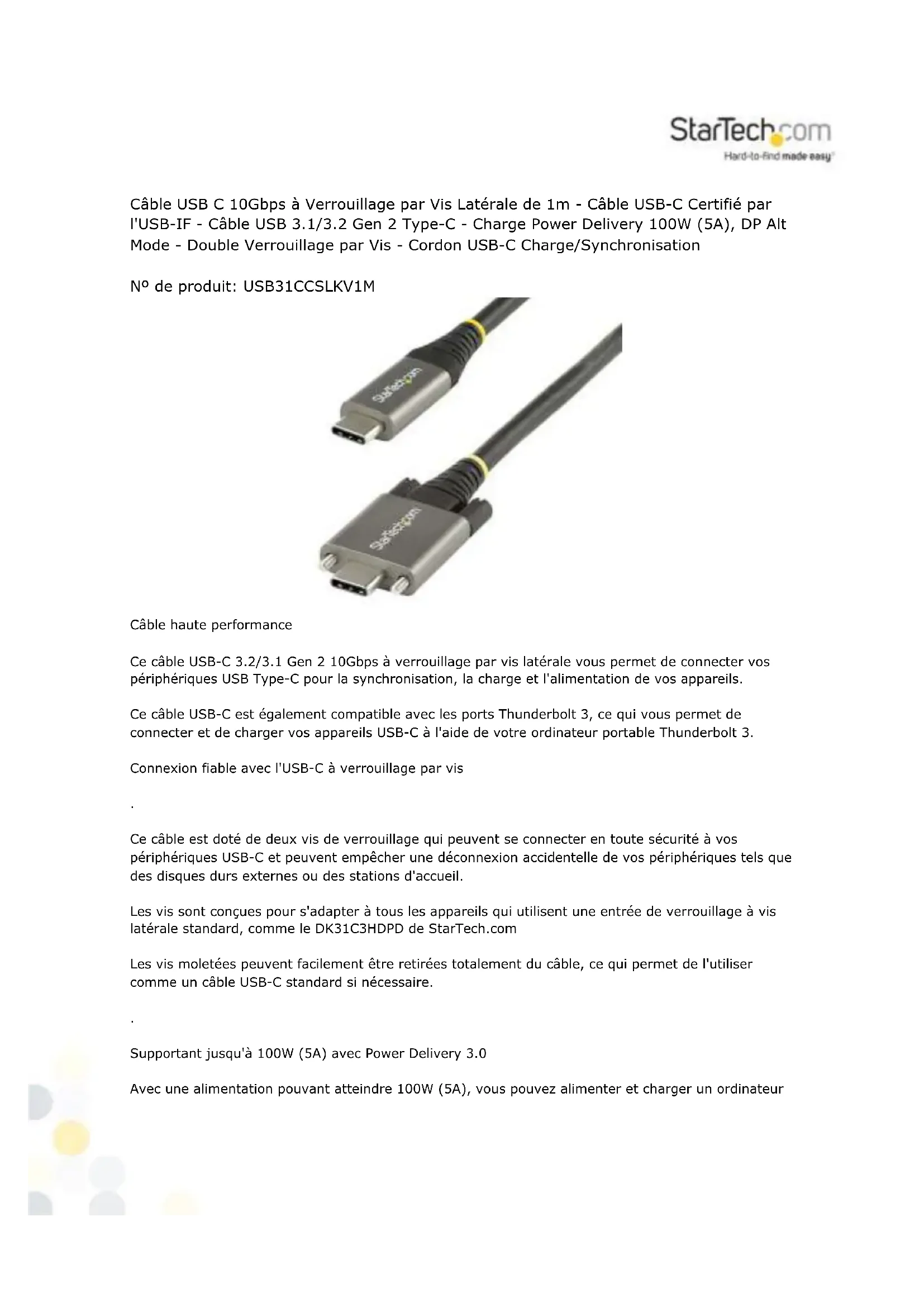- APPLICATIONS : Câble USB Type-C pour les stations d'accueil avec port USB C à double verrouillage latéral comme le DK31C3HDPD de StarTech.com ; vis amovible pour les boîtiers de disques durs et les périphériques de stockage externes ; charge d'un ordinateur portable de station de travail TB3/USBC MacBook/Surface Book/ThinkPad.