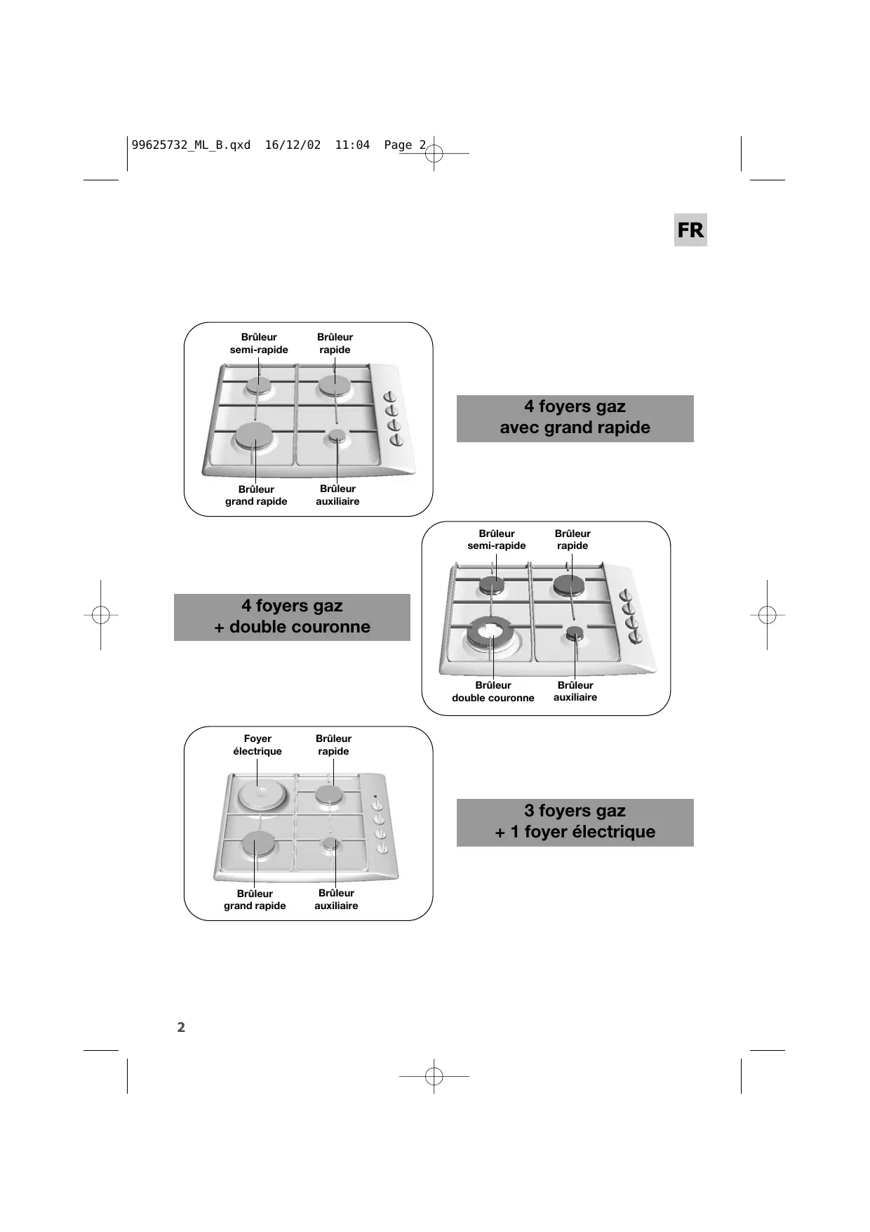 | Type de foyer | Gaz / Électrique / Induction (selon modèle) |