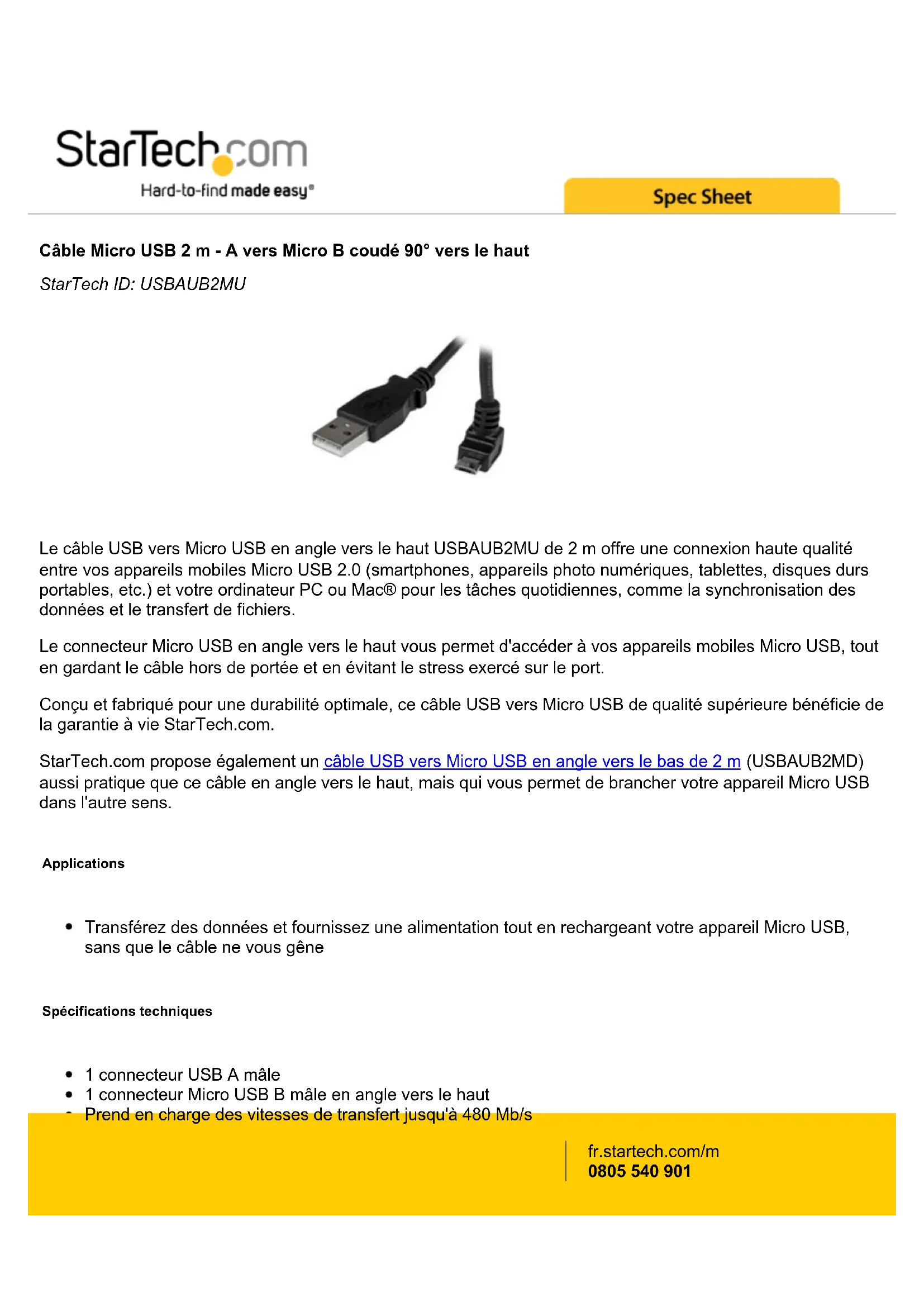 Câble Micro USB 2 m - A vers Micro B coudé 90° vers le haut StarTech ID: USBAUB2MU Le câble USB vers Micro USB en angle vers le haut USBAUB2MU de 2 m offre une connexion haute qualité entre vos appareils mobiles Micro USB 2.0 (smartphones, appareils photo numériques, tablettes, disques durs portables, etc.) et votre ordinateur PC ou Mac® pour les tâches quotidiennes, comme la synchronisation des données et le transfert de fichiers. Le connecteur Micro USB en angle vers le haut vous permet d'accéder à vos appareils mobiles Micro USB, tout en gardant le câble hors de portée et en évitant le stress exercé sur le port. Conçu et fabriqué pour une durabilité optimale, ce câble USB vers Micro USB de qualité supérieure bénéficie de la garantie à vie StarTech.com. StarTech.com propose également un câble USB vers Micro USB en angle vers le bas de 2 m (USBAUB2MD) aussi pratique que ce câble en angle vers le haut, mais qui vous permet de brancher votre appareil Micro USB dans l'autre sens. Applications Transférez des données et fournissez une alimentation tout en rechargeant votre appareil Micro USB, sans que le câble ne vous gêne Spécifications techniques 1 connecteur USB A mâle 1 connecteur Micro USB B mâle en angle vers le haut Prend en charge des vitesses de transfert jusqu'à 480 Mb/s Feuille d'aluminium-Mylar avec blindage tressé Connecteurs moulés avec serre-câble Offre 2 m de longueur de câble fr.startech.com/m 0805 540 901Spécifications techniques Warranty Lifetime Placage du connecteur Nickel Type de gaine de câble PVC - Polyvinyl Chloride Type de blindage du câble Feuille d'aluminium-Mylar avec blindage tressé Connecteur A 1 - USB A (4 pin) Mâle Connecteur B 1 - USB Micro-B (5 pin) Mâle Type et débit USB 2.0 - 480 Mbit/s Couleur Noir Style de connecteur Droit à angle vers le haut Calibre du fil 28 AWG Longueur de câble 2000 mm [78.7 in] Longueur du produit 2000 mm [78.7 in] Poids du produit 43 g [1.5 oz] Quantité par paquet 1 Poids brut 0 kg [0.1 lb] Inclus dans le paquet 1 - Câble Micro USB 2 m - A vers Micro B en angle vers le haut Certifications, rapports et compatibilité fr.startech.com/m