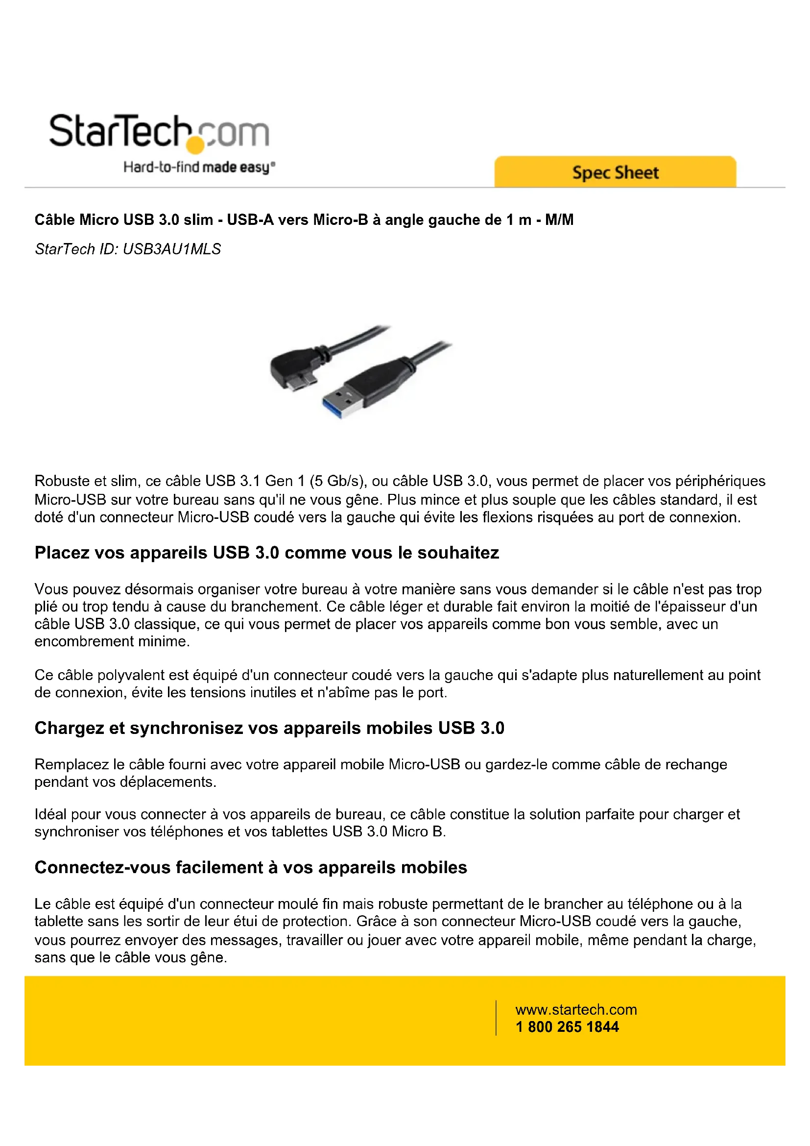 Câble Micro USB 3.0 slim - USB-A vers Micro-B à angle gauche de 1 m - M/M StarTech ID: USB3AU1MLS Robusteetslim,cecâbleUSB3.1Gen1(5Gb/s),oucâbleUSB3.0,vouspermetdeplacervospériphériques Micro-USBsurvotrebureausansqu'ilnevousgêne.Plusminceetplussouplequelescâblesstandard,ilest dotéd'unconnecteurMicro-USBcoudéverslagauchequiévitelesflexionsrisquéesauportdeconnexion. Placez vos appareils USB 3.0 comme vous le souhaitez Vouspouvezdésormaisorganiservotrebureauàvotremanièresansvousdemandersilecâblen'estpastrop pliéoutroptenduàcausedubranchement.Cecâblelégeretdurablefaitenvironlamoitiédel'épaisseurd'un câbleUSB3.0classique,cequivouspermetdeplacervosappareilscommebonvoussemble,avecun encombrementminime. Cecâblepolyvalentestéquipéd'unconnecteurcoudéverslagauchequis'adapteplusnaturellementaupoint deconnexion,évitelestensionsinutilesetn'abîmepasleport. Chargez et synchronisez vos appareils mobiles USB 3.0 RemplacezlecâblefourniavecvotreappareilmobileMicro-USBougardez-lecommecâblederechange pendantvosdéplacements. Idéalpourvousconnecteràvosappareilsdebureau,cecâbleconstituelasolutionparfaitepourchargeret synchroniservostéléphonesetvostablettesUSB3.0MicroB. Connectez-vous facilement à vos appareils mobiles Lecâbleestéquipéd'unconnecteurmouléfinmaisrobustepermettantdelebrancherautéléphoneouàla tablettesanslessortirdeleurétuideprotection.GrâceàsonconnecteurMicro-USBcoudéverslagauche, vouspourrezenvoyerdesmessages,travailleroujoueravecvotreappareilmobile,mêmependantlacharge, sansquelecâblevousgêne. www.startech.com 1 800 265 1844LemodèleUSB3AU1MLSde1mètrebénéficiedelagarantieàvieStarTech.com,pourunefiabilitéassurée. Applications ConnectezdesappareilsMicroUSB3.0(disquedurportable,lecteurdecarte,dispositifd'acquisition vidéo,boîtierdedisquedur,etc.)àunordinateurdebureauouportablecompatibleUSB3.0 ChargezetsynchronisezvosappareilsnumériquesmobilesUSB3.0Micro-B Features PositionnezvosappareilsUSB3.0àvotreguisedansvotreespacedetravail Connectez-vousàvotreappareilmêmedanslesespacesréduitsetdifficilesd'accès Chargezetsynchronisezvosappareilsmobilessanslessortirdeleurétuideprotection Technical Specifications Warranty Lifetime Placageduconnecteur Nickel Typedeblindageducâble Feuilled'aluminium-Mylaravecblindagetressé Typedegainedecâble PVC-PolyvinylChloride Typeetdébit USB3.0-5Gb/s ConnecteurA 1-USB3.0A(9broches;SuperSpeed)Mâle ConnecteurB 1-USB3.0Micro-B(10broches;SuperSpeed)Mâle Calibredufil 26/32AWG Couleur Noir Hauteurduproduit 0.2in[6mm] Largeurduproduit 0.8in[20mm] Longueurdecâble 3.3ft[1m] Longueurduproduit 3.3ft[1m] Poidsduproduit 1.1oz[30g] Styledeconnecteur Droitàanglegauche Poidsbrut 1.3oz[36g] Quantitéparpaquet 1 Inclusdanslepaquet 1-CâbleMicroUSB3.0slimcoudéverslagauchede1m www.startech.com 1 800 265 1844Certifications, Reports and Compatibility www.startech.com