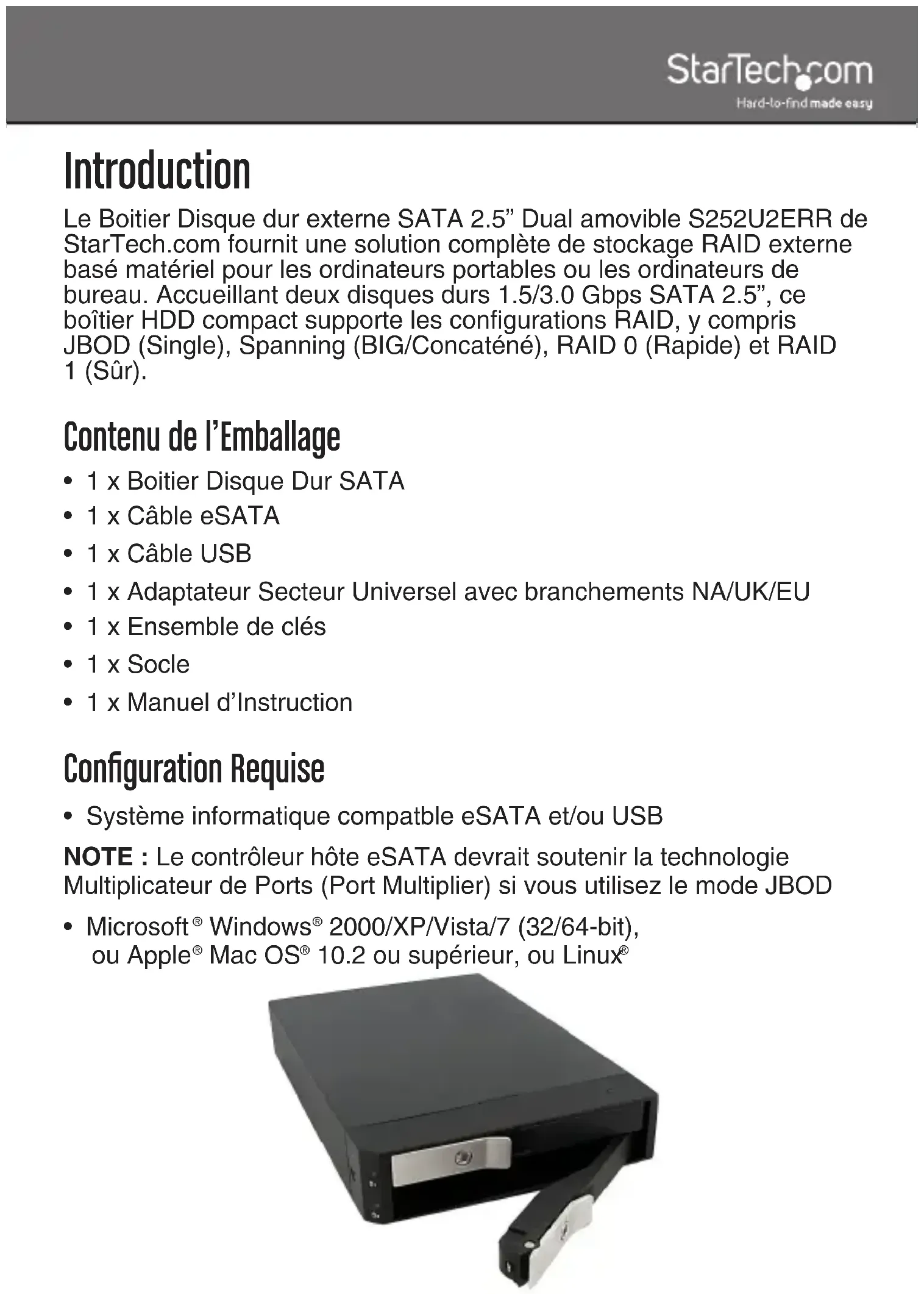 - Consulter votre revendeur ou un technicien radio / TV pour de l’aide. Utilisation des marques, marques déposées, et d’autres dénominations et symboles protégés Ce manuel peut faire référence à des marques, marques déposées, et d’autres dénominations et symboles protégés de sociétés tierces non liés en aucune façon à StarTech.com. Ces références sont à titre indicatif seulement et ne constituent pas une approbation d’un produit ou service par StarTech.com, ou un endossement du/des produit(s) auquel ce manuel s’applique par la société tierce en question. Indépendamment de toute reconnaissance directe dans le corps de manuel, StarTech.com reconnaît que toutes les marques, marques déposées, marques de service, et autres symboles et/ou dénominations protégées contenus dans ce manuel et les documents connexes sont la propriété de leurs détenteurs respectifs.i Table des Matières Introduction ..................................................................... 1 Contenu de l’Emballage .............................................................. 1 Configuration Requise ................................................................. 1 Vue Avant .................................................................................... 2 Vue Arrière................................................................................... 2 Installation ....................................................................... 3 Installation du Pilote .................................................................... 4 Modes de Fonctionnement .......................................................... 4 Utilisation du Périphérique de Stockage ....................... 5 Spécifications .................................................................. 7 Support Technique .......................................................... 8 Informations sur la Garantie .......................................... 81 Introduction Le Boitier Disque dur externe SATA 2.5” Dual amovible S252U2ERR de StarTech.com fournit une solution complète de stockage RAID externe basé matériel pour les ordinateurs portables ou les ordinateurs de bureau. Accueillant deux disques durs 1.5/3.0 Gbps SATA 2.5”, ce boîtier HDD compact supporte les configurations RAID, y compris JBOD (Single), Spanning (BIG/Concaténé), RAID 0 (Rapide) et RAID 1 (Sûr). Contenu de l’Emballage