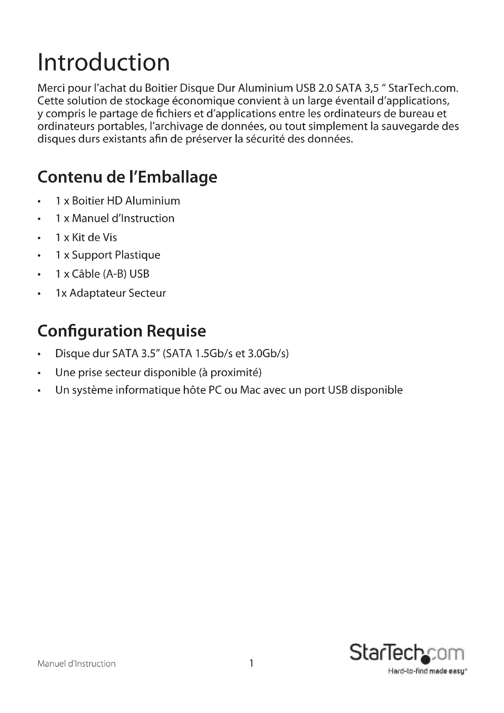 Introduction Merci pour l’achat du Boitier Disque Dur Aluminium USB 2.0 SATA 3,5 “ StarTech.com. Cette solution de stockage économique convient à un large éventail d’applications, y compris le partage de chiers et d’applications entre les ordinateurs de bureau et ordinateurs portables, l’archivage de données, ou tout simplement la sauvegarde des disques durs existants an de préserver la sécurité des données. Contenu de l’Emballage