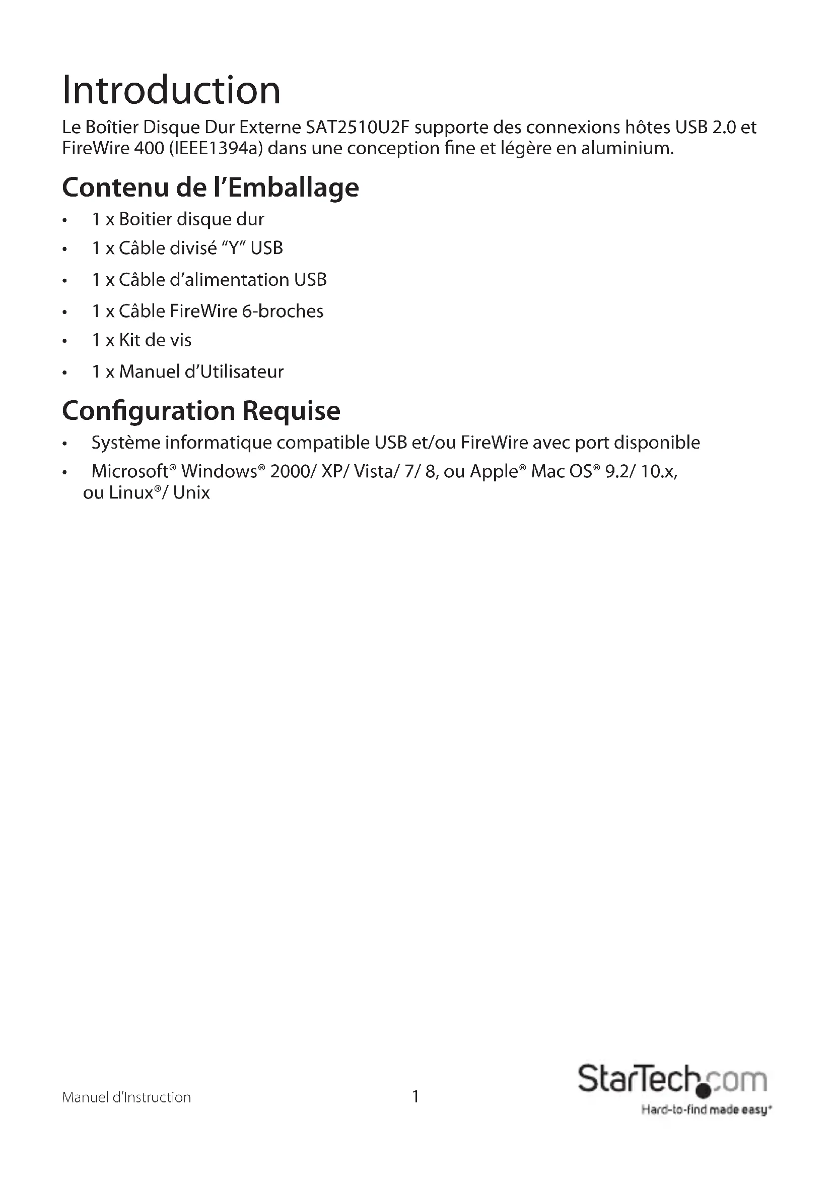 Introduction Le Boîtier Disque Dur Externe SAT2510U2F supporte des connexions hôtes USB 2.0 et FireWire 400 (IEEE1394a) dans une conception ne et légère en aluminium. Contenu de l’Emballage