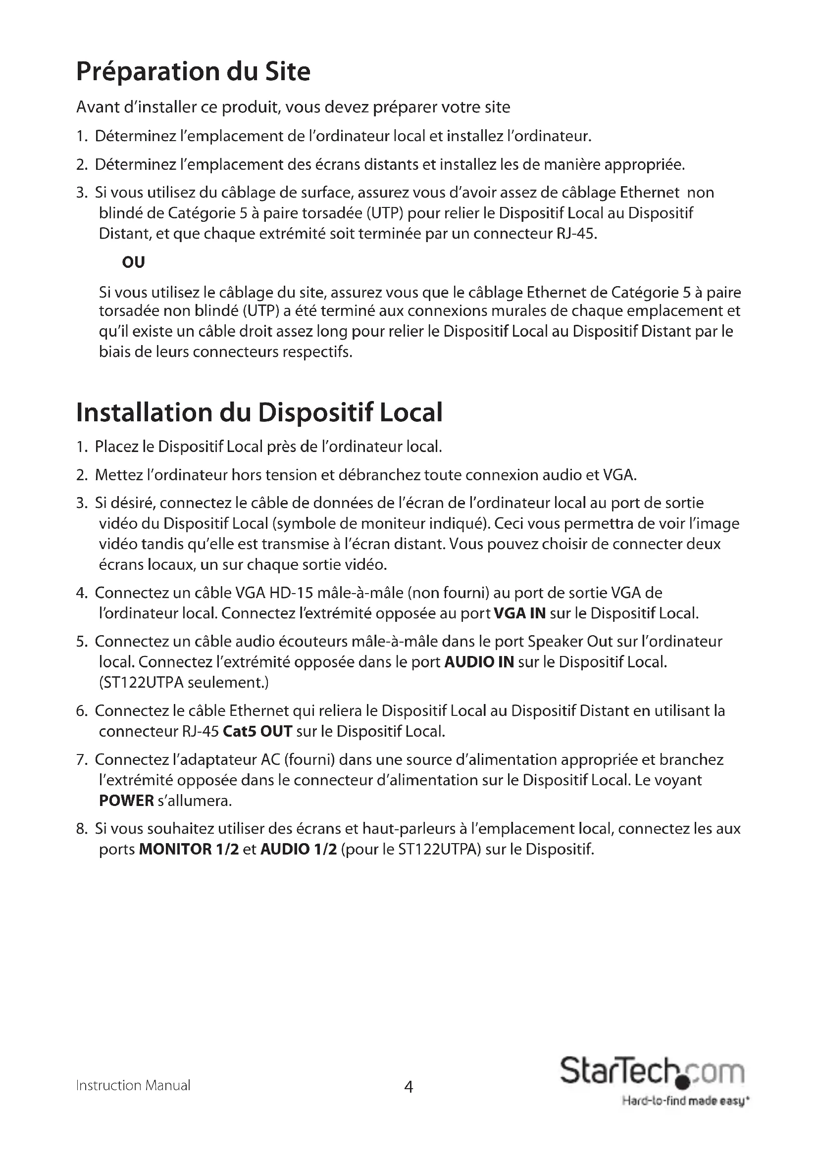 - 1 x Manuel d’Instruction Connexion du Prolongateur de Signal Ce produit est composé de deux diérents dispositifs : le Dispositif Local et le Dispositif Distant. Le Dispositif Local prend le signal sortant d’une source VGA (et audio, si vous avez acheté le ST122UTPA) (en général un ordinateur) et le transmet au Dispositif Distant à travers un câble Ethernet de Catégorie 5. Les écrans distants (moniteur, projecteur) se connectent au Dispositif Distant en utilisant les connexions standards VGA et écouteurs (si désiré) et achent l’image provenant de l’ordinateur local.Instruction Manual