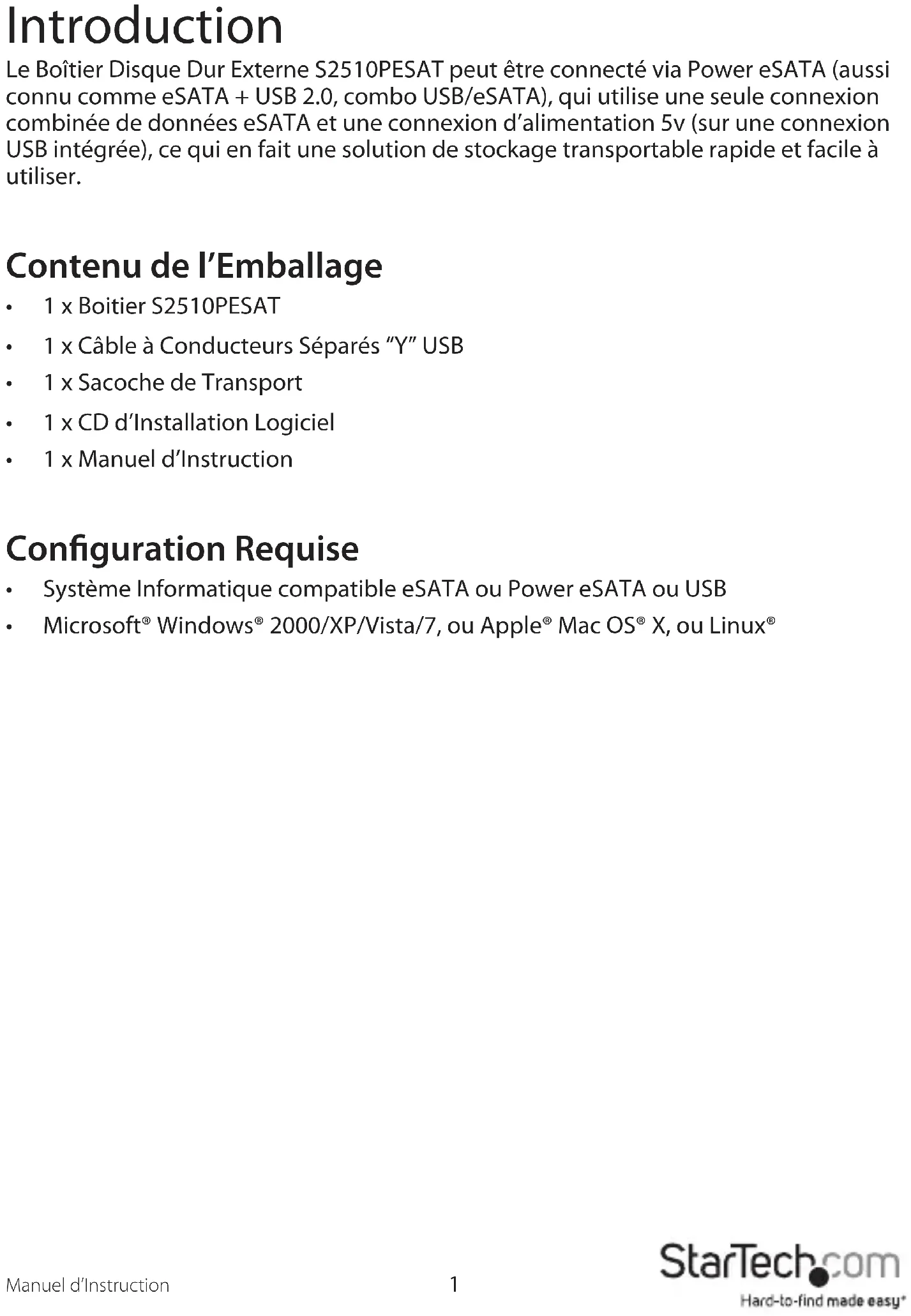 Révision du Manuel: 08/08/2011 Pour les informations les plus récentes, veuillez visiter www.startech.com DE: Bedienungsanleitung - de.startech.com FR: Guide de l'utilisateur - fr.startech.com ES: Guía del usuario - es.startech.com IT: Guida per l'uso - it.startech.com NL: Gebruiksaanwijzing - nl.startech.com PT: Guia do usuário - pt.startech.com S2510PESAT *Le produit actuel peut varier de la photos Boitier Disque Dur eSATA à SATA Silver Power 2.5” avec Sauvegarde Une ToucheManuel d’Instruction Déclaration de conformité FCC Cet équipement a été testé et déclaré conforme en tant que dispositif numérique de classe B, conformément à la section 15 des règles FCC. Ces limites sont conçues pour fournir une protection raisonnable contre les interférences nuisibles dans une installation résidentielle. Cet équipement génère, utilise et peut émettre des fréquences radio et, s’il n’est pas installé et utilisé conformément aux instructions, il peut causer des interférences nuisibles aux communications radio. Cependant, il n’existe aucune garantie que des interférences ne se produiront pas dans une installation de type particulier. Si cet équipement provoque des interférences nuisibles à la réception de la radio ou de la télévision, pouvant être vérié en mettant l’équipement hors tension, l’utilisateur est encouragé à essayer de corriger l’interférence par une ou plusieurs des mesures suivantes: