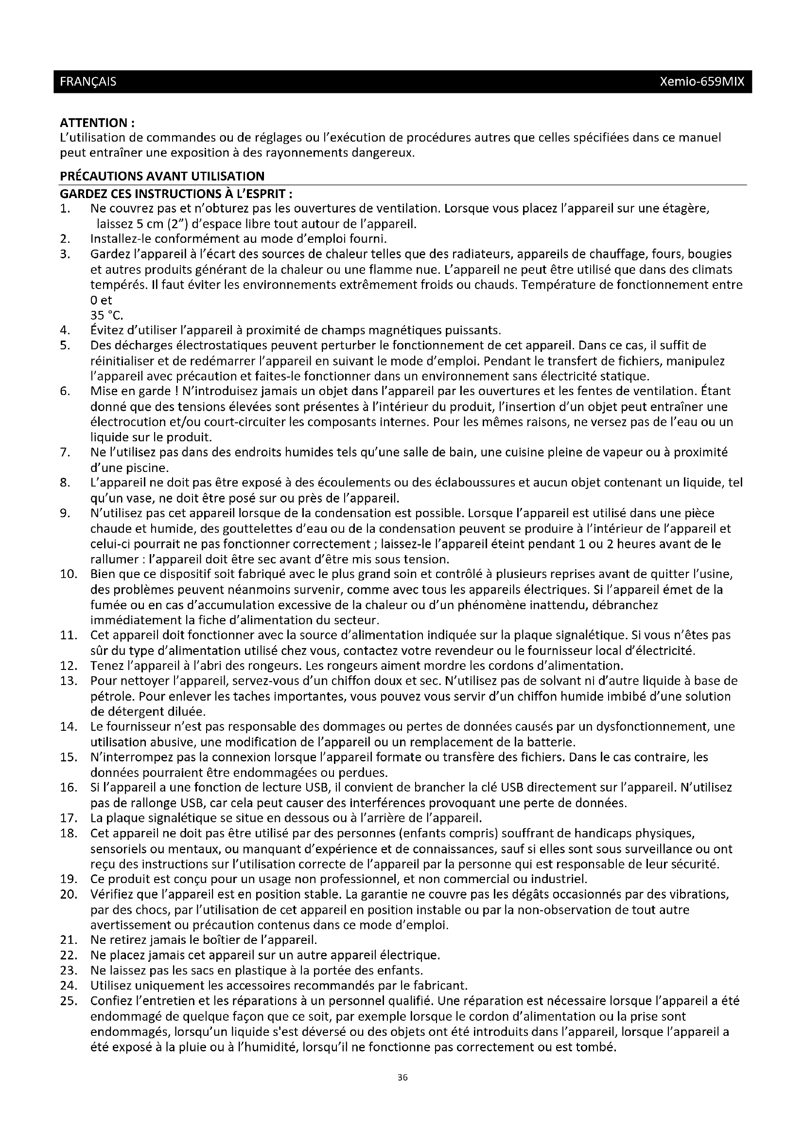 25. Confiez l’entretien et les réparations à un personnel qualifié. Une réparation est nécessaire lorsque l’appareil a été endommagé de quelque façon que ce soit, par exemple lorsque le cordon d’alimentation ou la prise sont endommagés, lorsqu’un liquide s'est déversé ou des objets ont été introduits dans l’appareil, lorsque l’appareil a été exposé à la pluie ou à l’humidité, lorsqu’il ne fonctionne pas correctement ou est tombé.37