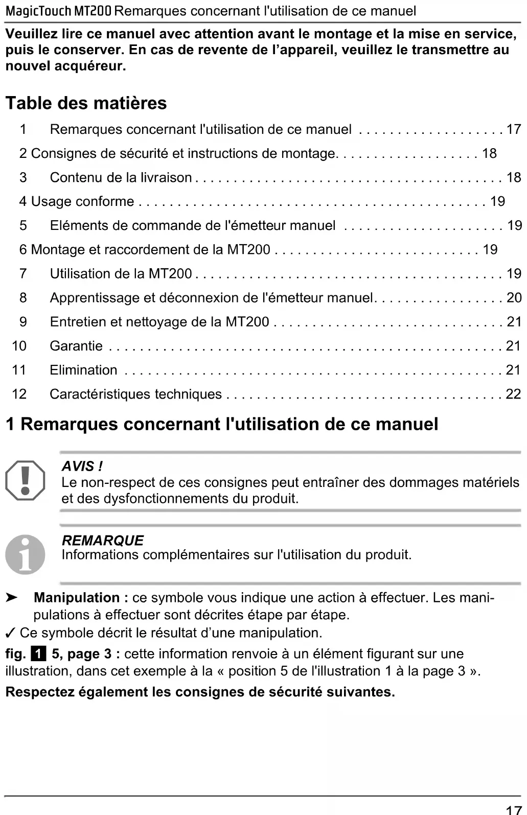 REMARQUE Informations complémentaires sur l'utilisation du produit. ➤ Manipulation : ce symbole vous indique une action à effectuer. Les mani- pulations à effectuer sont décrites étape par étape. ✓ Ce symbole décrit le résultat d’une manipulation. fig. 1 5, page 3 : cette information renvoie à un élément figurant sur une illustration, dans cet exemple à la « position 5 de l'illustration 1 à la page 3 ». Respectez également les consignes de sécurité suivantes. _MT200.book Seite 17 Freitag, 8. April 2011 3:14 15Consignes de sécurité et instructions de montage MagicTouch MT200