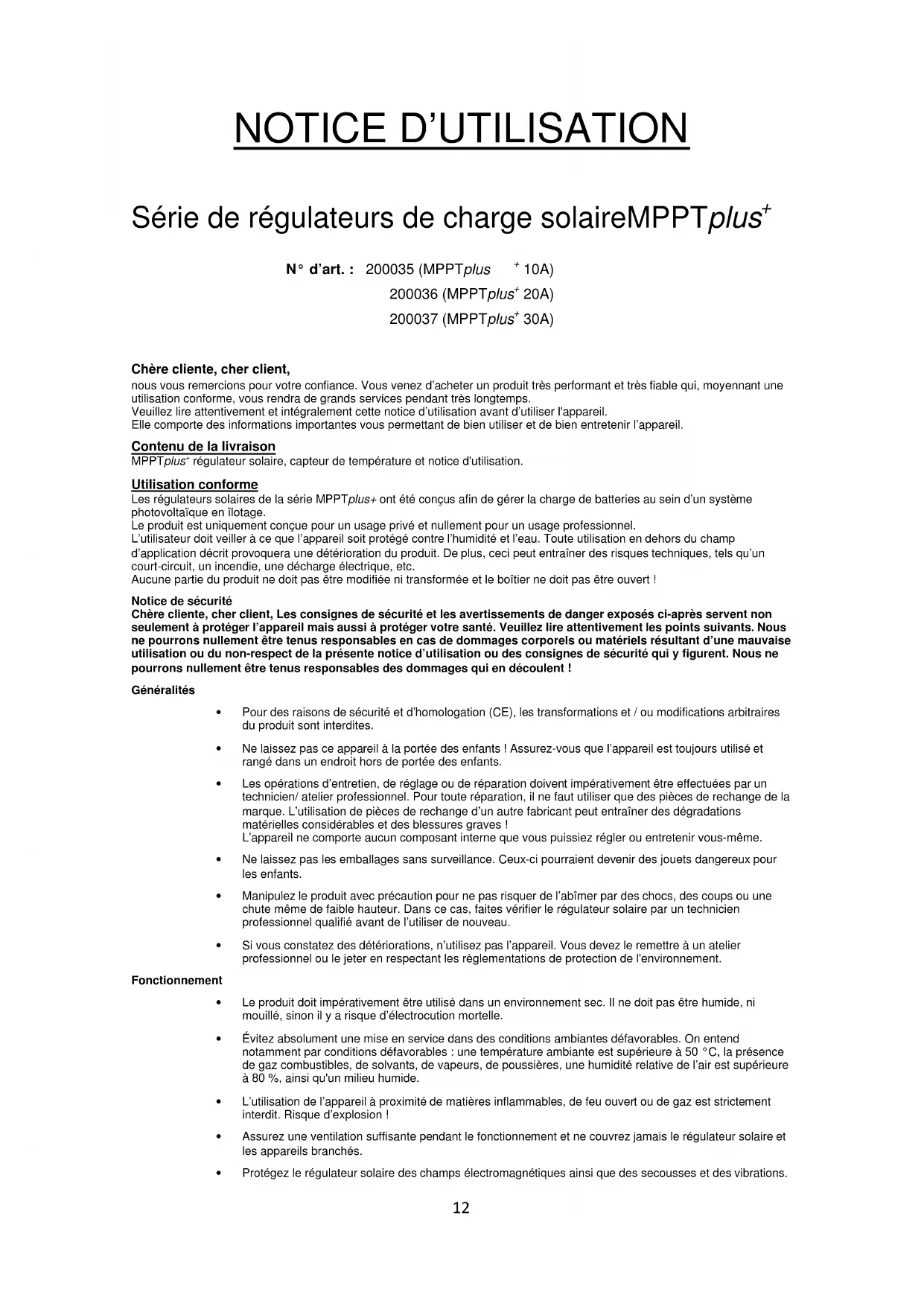 Chère cliente, cher client, nous vous remercions pour votre confiance. Vous venez d’acheter un produit très performant et très fiable qui, moyennant une utilisation conforme, vous rendra de grands services pendant très longtemps. Veuillez lire attentivement et intégralement cette notice d’utilisation avant d’utiliser l'appareil. Elle comporte des informations importantes vous permettant de bien utiliser et de bien entretenir l’appareil. Contenu de la livraison MPPTplus régulateur solaire, capteur de température et notice d'utilisation. Utilisation conforme Les régulateurs solaires de la série MPPTplus+ ont été conçus afin de gérer la charge de batteries au sein d’un système photovoltaïque en îlotage. Le produit est uniquement conçue pour un usage privé et nullement pour un usage professionnel. L’utilisateur doit veiller à ce que l’appareil soit protégé contre l’humidité et l’eau. Toute utilisation en dehors du champ d’application décrit provoquera une détérioration du produit. De plus, ceci peut entraîner des risques techniques, tels qu’un court-circuit, un incendie, une décharge électrique, etc. Aucune partie du produit ne doit pas être modifiée ni transformée et le boîtier ne doit pas être ouvert ! Notice de sécurité Chère cliente, cher client, Les consignes de sécurité et les avertissements de danger exposés ci-après servent non seulement à protéger l’appareil mais aussi à protéger votre santé. Veuillez lire attentivement les points suivants. Nous ne pourrons nullement être tenus responsables en cas de dommages corporels ou matériels résultant d’une mauvaise utilisation ou du non-respect de la présente notice d’utilisation ou des consignes de sécurité qui y figurent. Nous ne pourrons nullement être tenus responsables des dommages qui en découlent ! Généralités