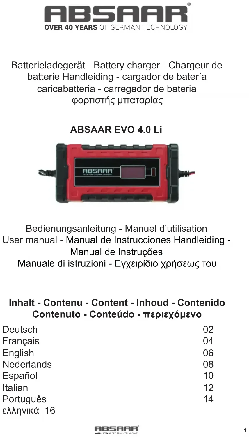 Manuel d’instruction ABSAAR EVO 4.0 Li Merci d’avoir acheté un chargeur de batterie ABSAAR. Avant d’utiliser le chargeur de batterie, lisez attentivement les consignes de sécurité. Notre chargeur ABSAAR EVO est adapté aux batteries plomb acide 6V et 12V, gel, agm et aux batteries 12V LifePo4. Des batteries allant jusqu’à 95Ah pourront être rechargées et des batteries allant jusqu’à 140 Ah pourront être maintenues en charge. Notre ABSAAR EVO dispose de plusieurs fonctions : de diagnostic, de protection et de récupération qui se déroulent entièrement automatiquement si la batterie connectée l’exige. Vous ne devez vous occuper de rien. Ces caractéristiques allongeront la durée de vie de votre batterie. Les connecteurs à œillets sont parfaits pour avoir une installation permanente sur les batteries qui sont montées dans des zones difficiles à atteindre par exemple : en moto ou en cabriolet. Et vous pouvez avoir une connexion rapide et parfaite avec la fiche d’adaptateur du chargeur. Consignes de sécurité