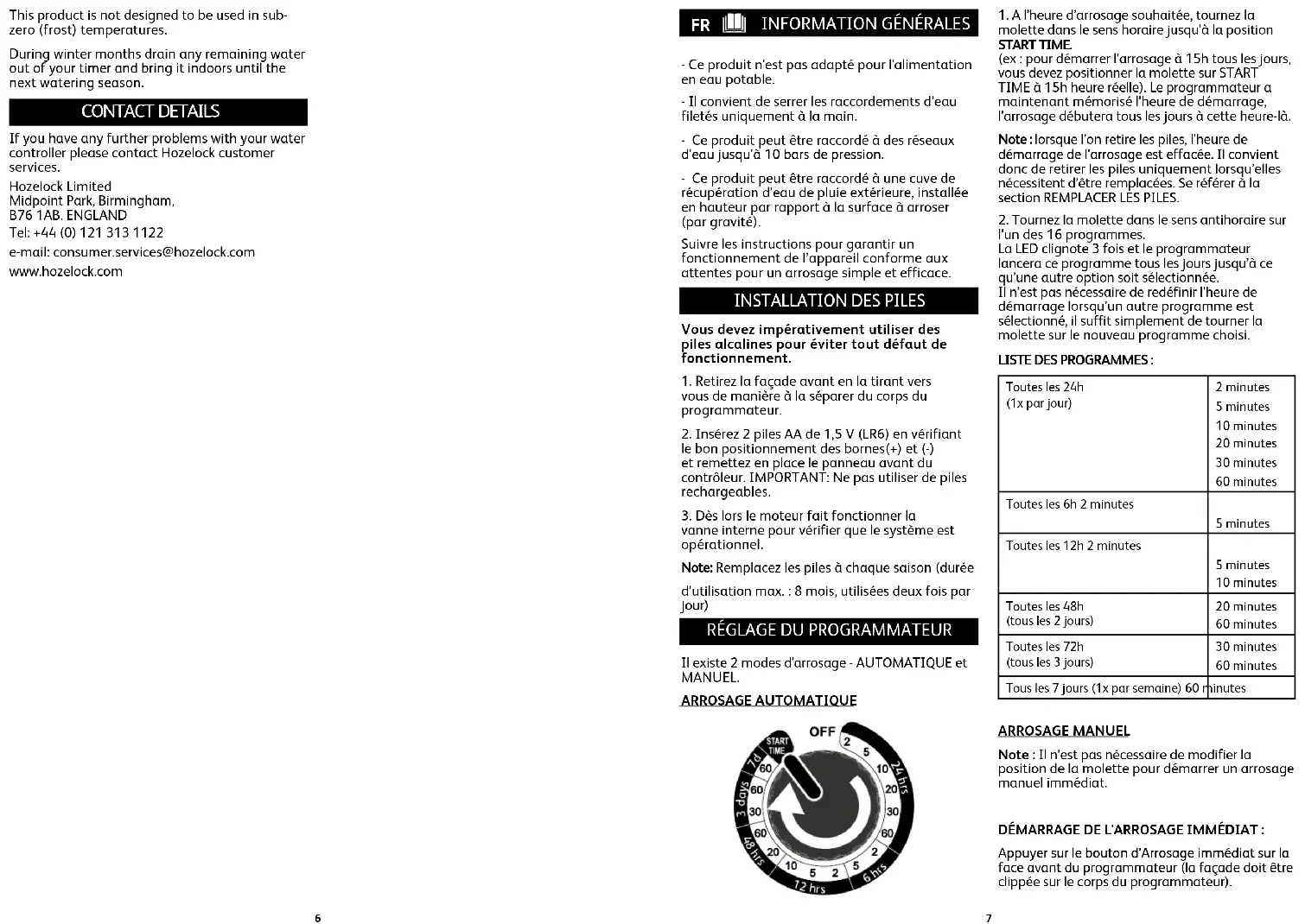 Température de l’eau max. 30°C Ce produit n’est pas conçu pour une utilisation à une température extérieure inférieure à 0°C. Durant ces périodes, il est fortement conseillé de vider le programmateur de son eau résiduelle et de stocker à l’intérieur jusqu’à la prochaine saison d’arrosage CONTACT En cas de problème avec votre programmateur d'arrosage, contactez le Service Client Hozelock Hozelock Limited Midpoint Park, Birmingham,