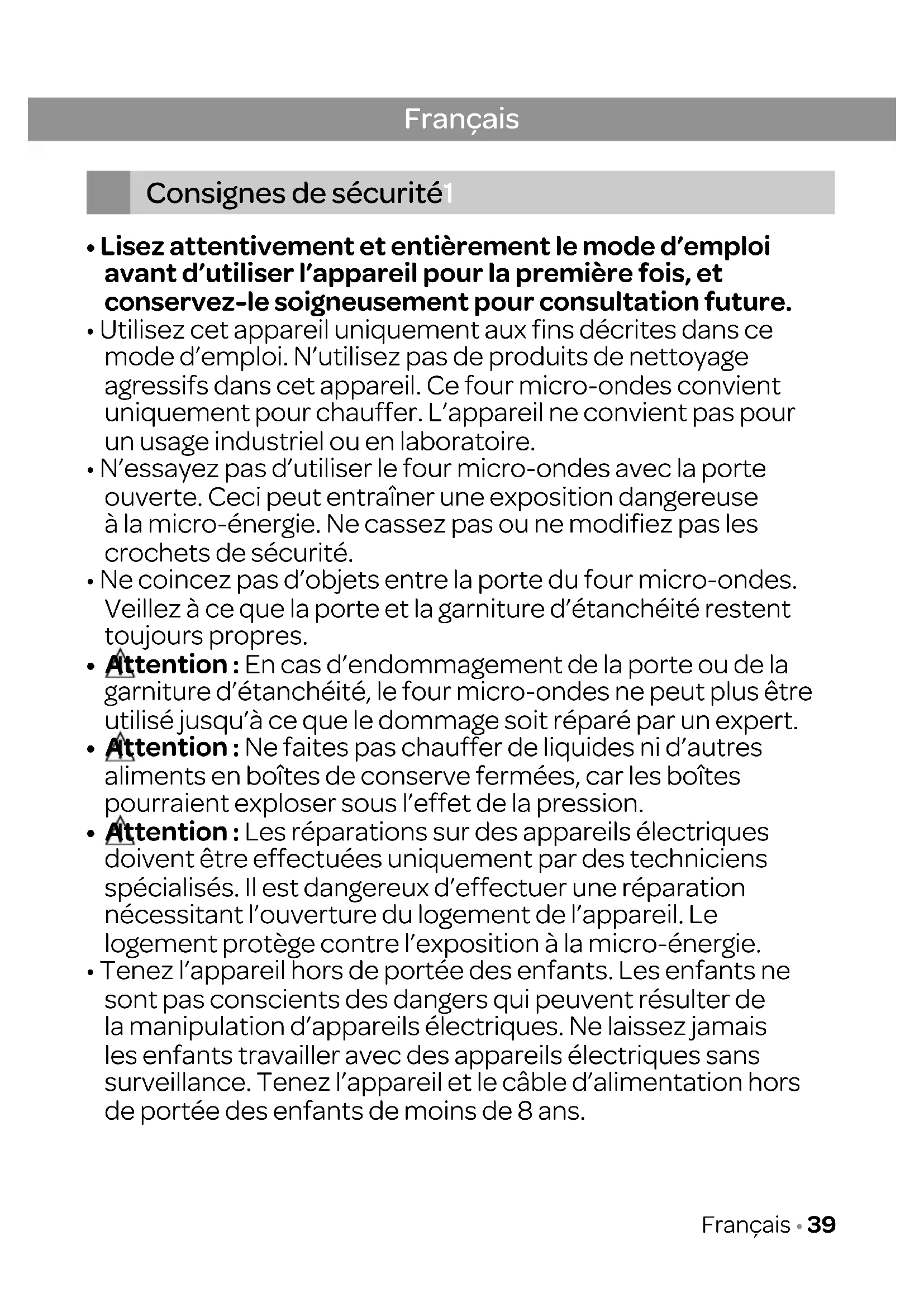 1. Consignes de sécurité page 39
