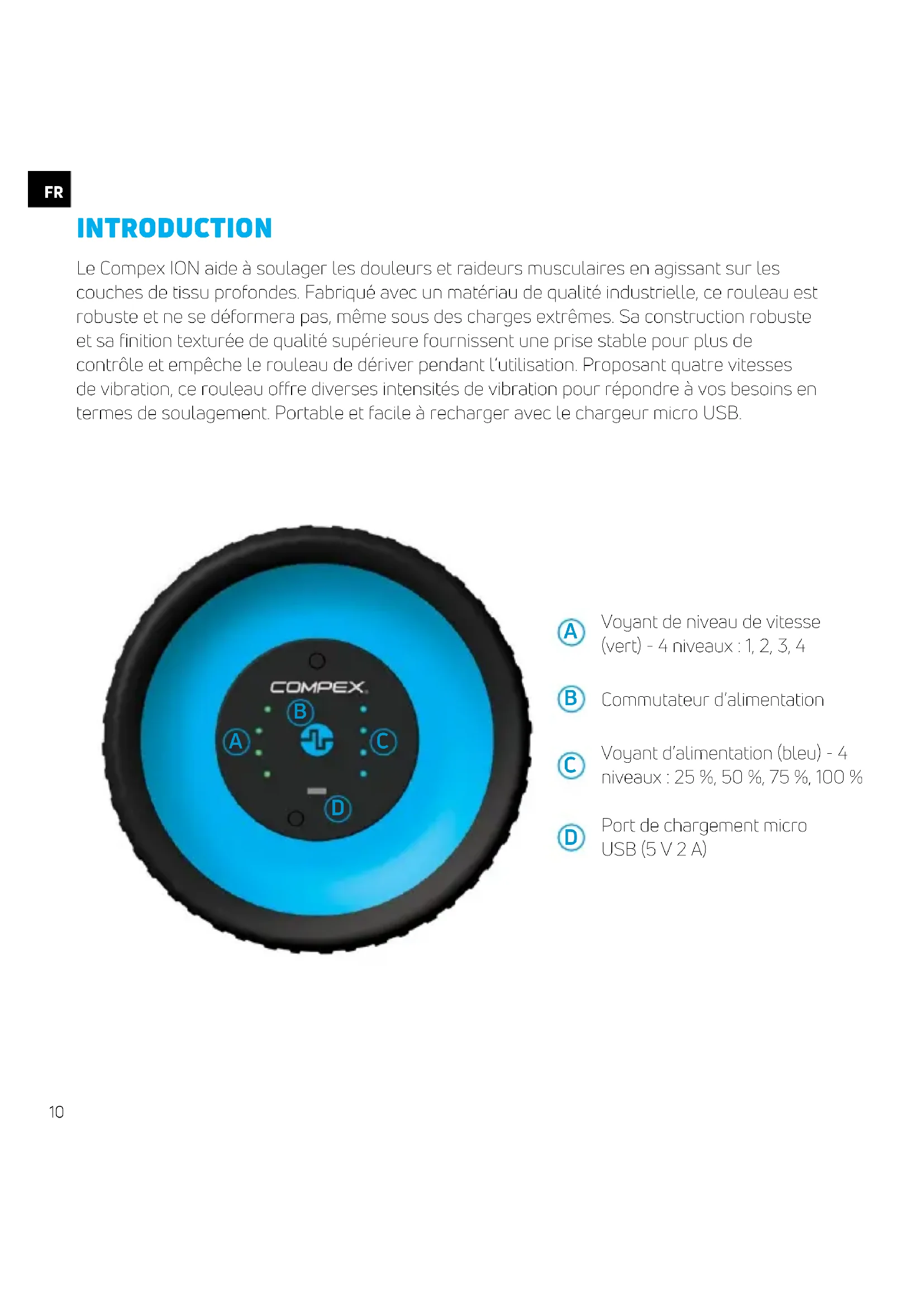 INTRODUCTION Le Compex ION aide à soulager les douleurs et raideurs musculaires en agissant sur les couches de tissu profondes. Fabriqué avec un matériau de qualité industrielle, ce rouleau est robuste et ne se déformera pas, même sous des charges extrêmes. Sa construction robuste et sa finition texturée de qualité supérieure fournissent une prise stable pour plus de contrôle et empêche le rouleau de dériver pendant l’utilisation. Proposant quatre vitesses de vibration, ce rouleau offre diverses intensités de vibration pour répondre à vos besoins en termes de soulagement. Portable et facile à recharger avec le chargeur micro USB.