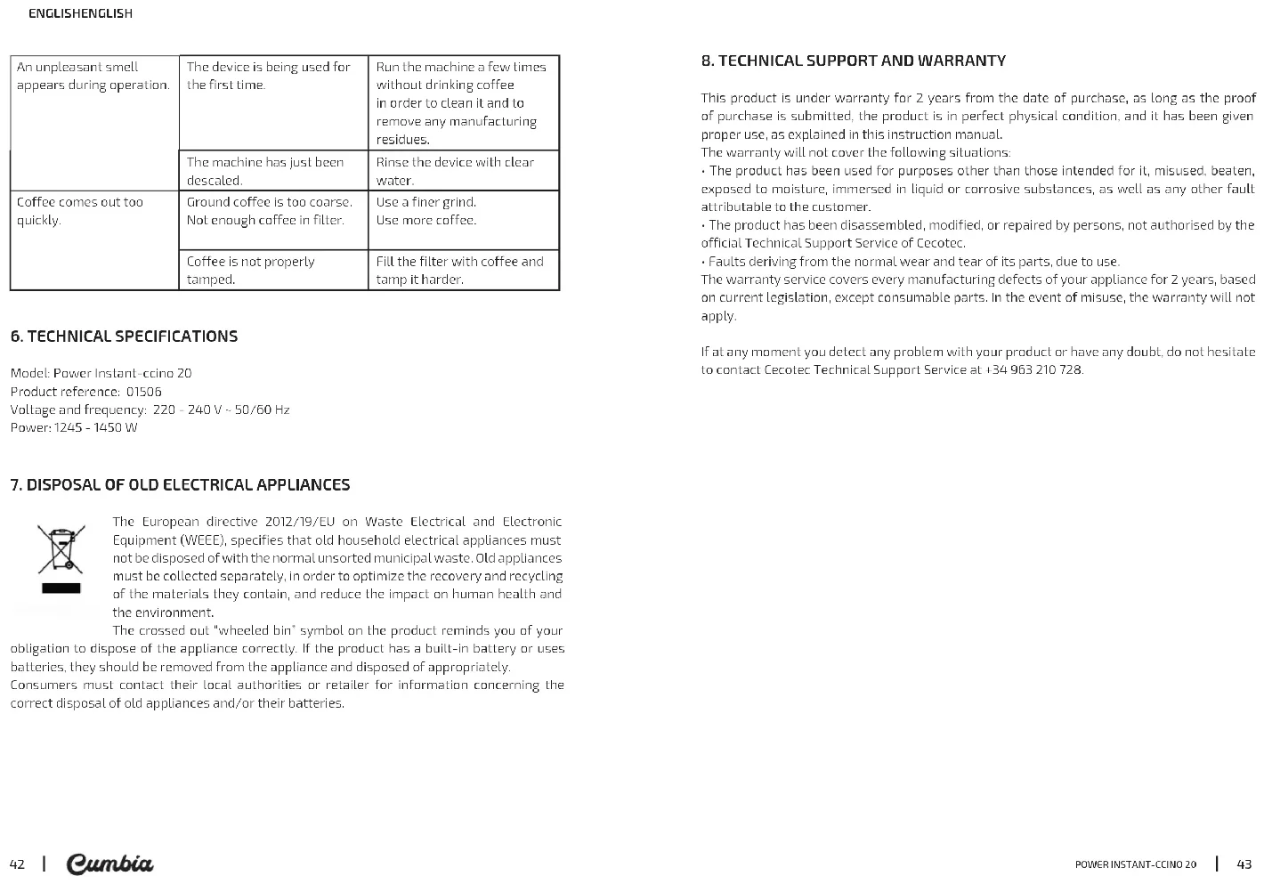 Ce produit possède une garantie de 2 ans à partir de la date d’achat, à condition de toujours présenter la facture d’achat, que le produit soit en parfait état, et ait été utilisé correctement comme indiqué dans ce manuel d’instructions. La garantie ne couvre pas : Un produit qui ait été utilisé en-dehors de ses capacités ou usages normaux, ayant subi des coups, ayant été abîmé, exposé à l’humidité, submergé dans un liquide ou une substance corrosive, ainsi que tous les incidents dont la faute serait imputable au consommateur. Un produit qui ait été démonté, modifié ou réparé par des personnes non autorisées par le Service Après-Vente Officiel de Cecotec. Lorsque le problème a été provoqué par l’usure normale des composants dû à l’utilisation. Le service de garantie couvre tous les défauts de fabrication pendant 2 ans selon la législation en vigueur, à l’exception des pièces consommables. Dans le cas d’une mauvaise utilisation de la part de l’utilisateur, le service de garantie ne se fera pas responsable de la réparation. Si vous détectez un incident ou un problème avec le produit, vous devez contacter le Service Après-Vente Officiel de Cecotec au +34 9 63 21 07 28.POWER INSTANT-CCINO 20