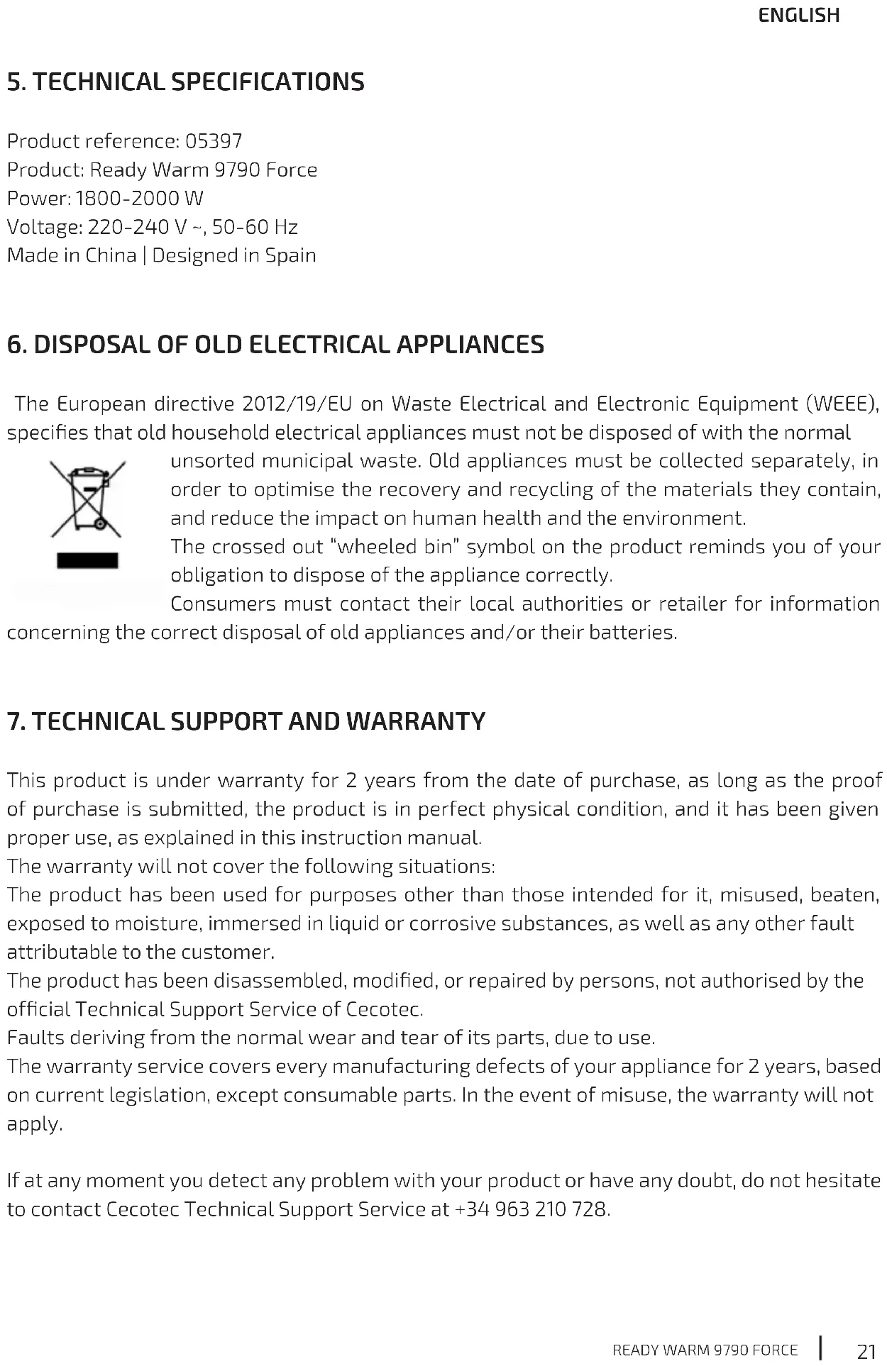 Ce produit possède une garantie de 2 ans à partir de la date d’achat, à condition de toujours présenter la facture d’achat, que le produit soit en parfait état, et ait été utilisé correctement comme indiqué dans ce manuel d’instructions. La garantie ne couvre pas : Un produit qui ait été utilisé en-dehors de ses capacités ou usages normaux, ayant subi des coups, ayant été abîmé, exposé à l’humidité, submergé dans un liquide ou une substance corrosive, ainsi que tous les incidents dont la faute serait imputable au consommateur. Un produit qui ait été démonté, modié ou réparé par des personnes non autorisées par le Service Après-Vente Ofciel de Cecotec. Lorsque le problème a été provoqué par l’usure normale des composants dû à l’utilisation. Le service de garantie couvre tous les défauts de fabrication pendant 2 ans selon la législationREADY WARM 9790 FORCE