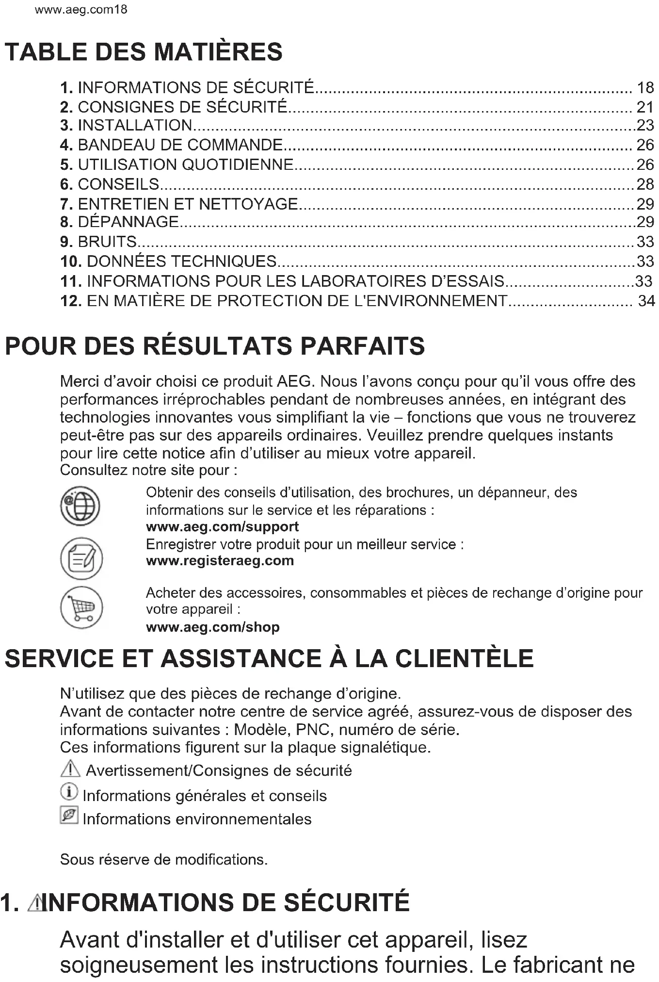 Avant d'installer et d'utiliser cet appareil, lisez soigneusement les instructions fournies. Le fabricant ne www.aeg.com18pourra être tenu pour responsable des blessures et dégâts résultant d'une mauvaise installation ou utilisation. Conservez toujours les instructions dans un lieu sûr et accessible pour vous y référer ultérieurement.