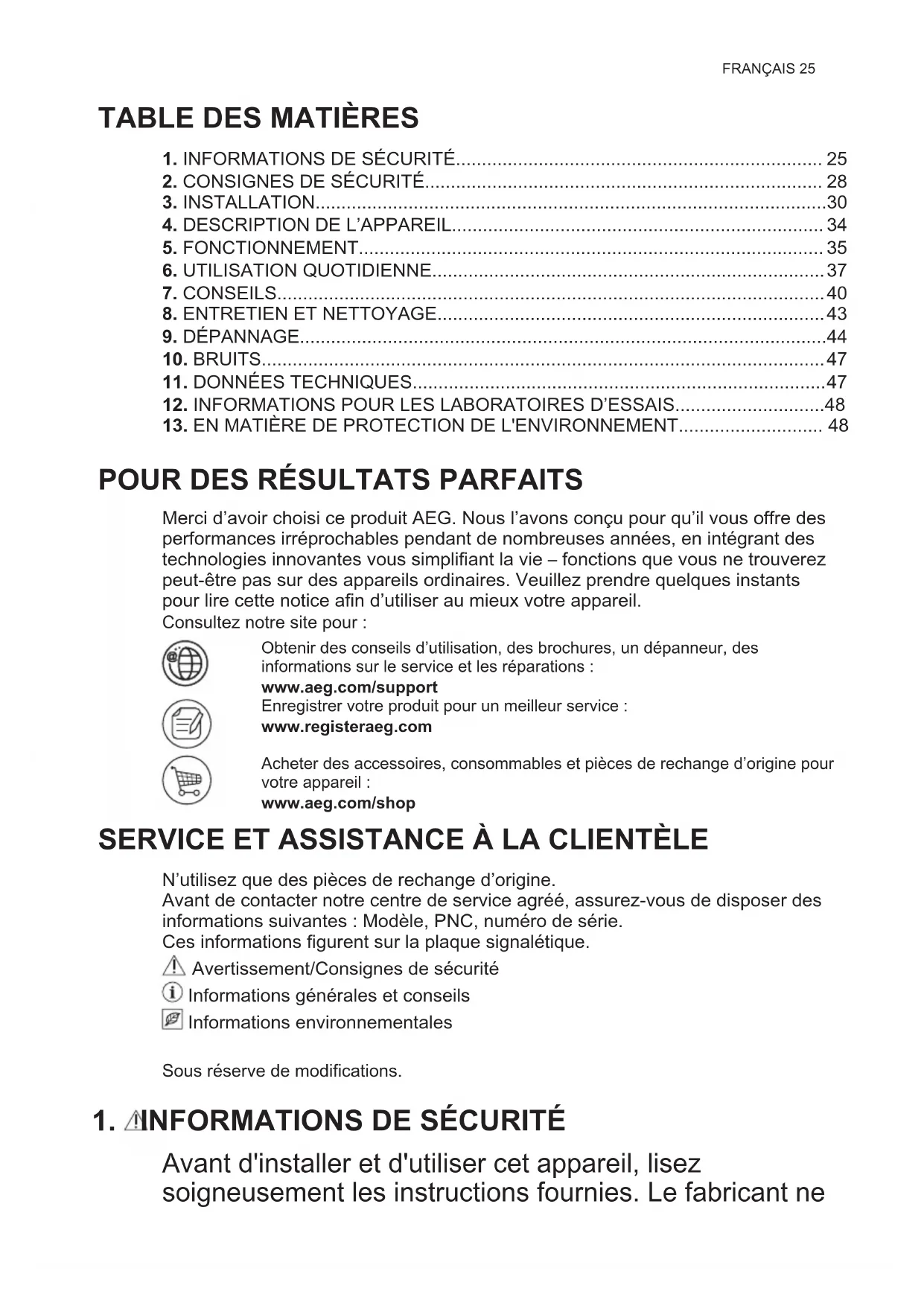 Merci d’avoir choisi ce produit AEG. Nous l’avons conçu pour qu’il vous offre des performances irréprochables pendant de nombreuses années, en intégrant des technologies innovantes vous simplifiant la vie – fonctions que vous ne trouverez peut-être pas sur des appareils ordinaires. Veuillez prendre quelques instants pour lire cette notice afin d’utiliser au mieux votre appareil. Consultez notre site pour : Obtenir des conseils d’utilisation, des brochures, un dépanneur, des informations sur le service et les réparations : www.aeg.com/support Enregistrer votre produit pour un meilleur service : www.registeraeg.com Acheter des accessoires, consommables et pièces de rechange d’origine pour votre appareil : www.aeg.com/shop