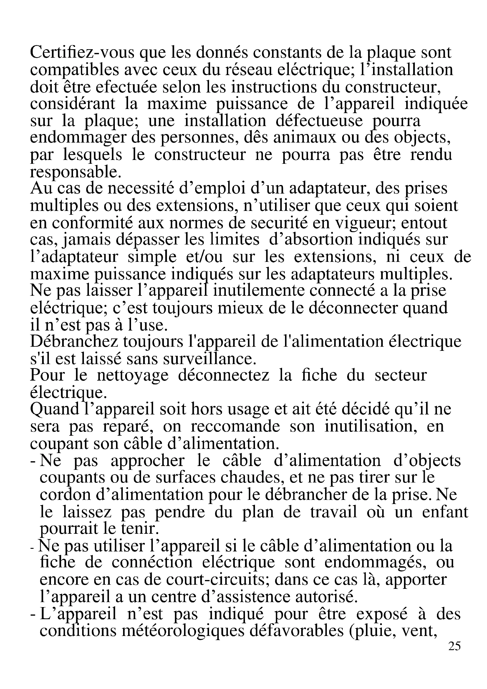 FRANCAIS: ADVERTISSEMENT Les indications suivantes sont très importantes en ce qui concerne l’installation, usage et manutention de cet appareil; gardez soigneusement ce manuel pour des futures consultations; n’utilisez pas l’appareil que selon les indications de ce manuel d’instructions; n’importe quel autre type d’ utilisation devra être consideré inaproprié et potentiellement dangereux; pour cette raison le constructeur ne pourra pas être rendu responsable si des dommages résultants de l’utilisation inapropriée ou irresponsable de l’appareil se produisent. Avant de l’utilisation, certifiez-vous de l’integrité de l’appareil; en cas de doute ne l’utilisez pas et addressez- vous a l’assistence téchnique autoriséa; ne laissez pas des parties de l’emballage (sacs de plastique, polystirène, ongles, agrafages, etc.) à la portée des enfants, car elles constituent des potentielles sources de danger; en autre, il faut rappeler que ces parties doivent être objet de collècte differencié de résidus.25 Certifiez-vous que les donnés constants de la plaque sont compatibles avec ceux du réseau eléctrique; l’installation doit être efectuée selon les instructions du constructeur, considérant la maxime puissance de l’appareil indiquée sur la plaque; une installation défectueuse pourra endommager des personnes, dês animaux ou des objects, par lesquels le constructeur ne pourra pas être rendu responsable. Au cas de necessité d’emploi d’un adaptateur, des prises multiples ou des extensions, n’utiliser que ceux qui soient en conformité aux normes de securité en vigueur; entout cas, jamais dépasser les limites d’absortion indiqués sur l’adaptateur simple et/ou sur les extensions, ni ceux de maxime puissance indiqués sur les adaptateurs multiples. Ne pas laisser l’appareil inutilemente connecté a la prise eléctrique; c’est toujours mieux de le déconnecter quand il n’est pas à l’use. Débranchez toujours l'appareil de l'alimentation électrique s'il est laissé sans surveillance. Pour le nettoyage déconnectez la fiche du secteur électrique. Quand l’appareil soit hors usage et ait été décidé qu’il ne sera pas reparé, on reccomande son inutilisation, en coupant son câble d’alimentation. - Ne pas approcher le câble d’alimentation d’objects coupants ou de surfaces chaudes, et ne pas tirer sur le cordon d’alimentation pour le débrancher de la prise. Ne le laissez pas pendre du plan de travail où un enfant pourrait le tenir. - Ne pas utiliser l’appareil si le câble d’alimentation ou la fiche de connéction eléctrique sont endommagés, ou encore en cas de court-circuits; dans ce cas là, apporter l’appareil a un centre d’assistence autorisé. - L’appareil n’est pas indiqué pour être exposé à des conditions météorologiques défavorables (pluie, vent,26 humidité, la glace, etc.); Gardez-le dans un endroit sec. Jamais opérer ou même toucher l’appareil avec les mains mouillées ou les pieds nus. - Cet appareil peut être utilisé par des enfants agés de plus de 8 ans et par des personnes avec une réduite capacité phisique, sensorial ou mental, ou encore avec peu d’expérience à son usage, pourvu qu’une supervision adéquate leur en soit assuré, ou s’ils auraient été instruits à l’usage de l’appareil en complete securité. Les opérations de nettoyage e de manutention ne oivent pás être efectués par des enfants, sauf pour ceux qui sont agés de plus de 8 ans et sont supervisionés. - Les enfants ne doivent pas jouer avec cet appareil. - Gardez l’appareil et le câble d’alimentation hors la portée des enfants agés de moins de 8 ans. Si le câble d'alimentation est endommagé ou en cas de panne et / ou de dysfonctionnement, ne modifiez pas l'appareil. Toute réparation doit être effectuée par le fabricant ou par son service d'assistance technique ou, en tout cas, par une personne possédant une qualification similaire, afin d'éviter tout risque. Le non-respect de ce qui précède peut compromettre la sécurité de l'appareil et invalider les conditions de la garantie. ATTENTION: Cet appareil comporte une fonction de chauffage. Quelques surfaces, même si non la plaque elle même, pourront atteindre des températures élevées. Étant donné que la sensibilité à la température diffère de personne à personne, cet appareil devrà être usé avec PRUDENCE. Placez l’appareil sur des surfaces adéhrentes et préparées pour cet effet, et utilisez les mésures de protection contre la chaleur conseillées. - Cet appareil est destiné à être utilisé dans les ménages et des applications similaires: les cuisines du personnel dans les magasins, bureaux et autres environnements de travail, pour les clients dans les hôtels, motels et autres27 environnements de type résidentiel, de type lit et petit- déjeuner, hébergement. - L’appareil n’est pas conçu pour être utilisé avec une minuterie extérieure ou un commande à distance. - N’utiliser que des accéssoires e pièces d’origine. Avant chaque utilisation, effectuez le cordon d'alimentation. Ne soumettez pas le produit à des chocs susceptibles de l'endommager. - Tenir l’appareil à l’écart des environnements où il peut y avoir des gaz, vapeurs, des substances inflammables ou explosives.