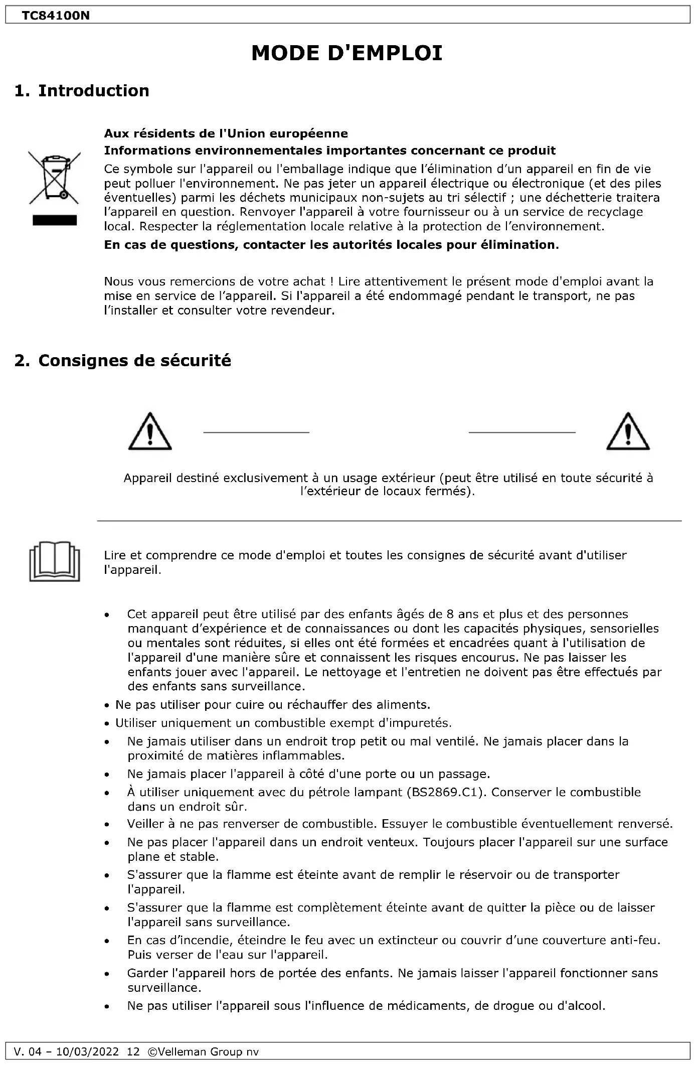 Velleman Group nv est l’ayant droit des droits d’auteur de ce mode d'emploi. Tous droits mondiaux réservés. Toute reproduction, traduction, copie ou diffusion, intégrale ou partielle, du contenu de ce mode d'emploi par quelque procédé ou sur tout support électronique que ce soit est interdite sans l’accord préalable écrit de l’ayant droit.TC84100N
