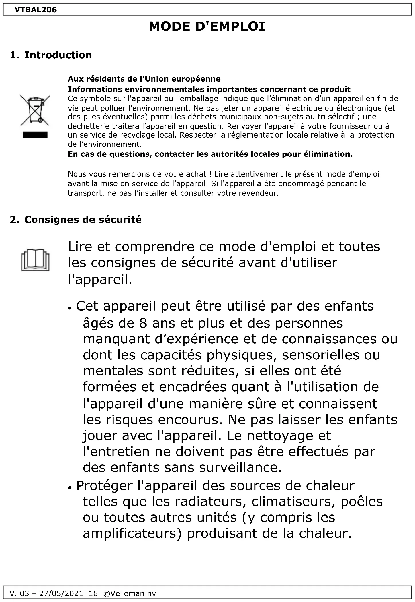 Velleman SA est l’ayant droit des droits d’auteur de ce mode d'emploi. Tous droits mondiaux réservés. Toute reproduction, traduction, copie ou diffusion, intégrale ou partielle, du contenu de ce mode d'emploi par quelque procédé ou sur tout support électronique que ce soit est interdite sans l’accord préalable écrit de l’ayant droit.VTBAL206
