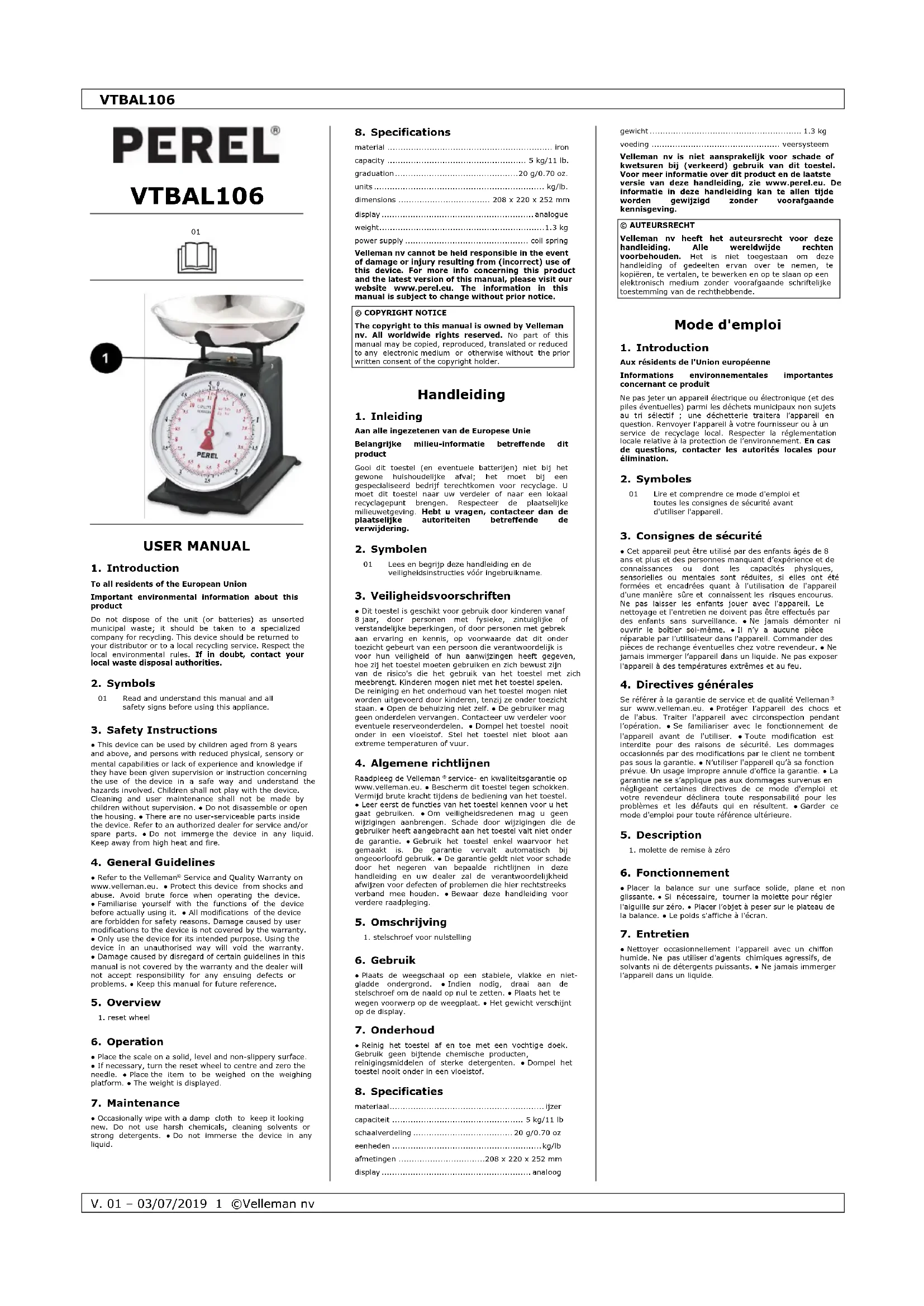 matériau ............................................................. fer capacité .................................................... 5 kg/11 lb graduation ............................................. 20 g/0.70 oz unités .............................................................. kg/lb dimensions ................................ 208 x 220 x 252 mm afficheur ................................................... analogique poids.............................................................. 1.3 kg alimentation.................................... système à ressort Velleman SA ne peut, dans la mesure conforme au droit applicable être tenue responsable des dommages ou lésions (directs ou indirects) pouvant résulter de l’utilisation de cet appareil. Pour plus d’informations concernant cet article et la dernière version de ce mode d'emploi, visiter notre site web www.perel.eu. Les spécifications et le continu de ce mode d'emploi peuvent être modifiés sans notification préalable.