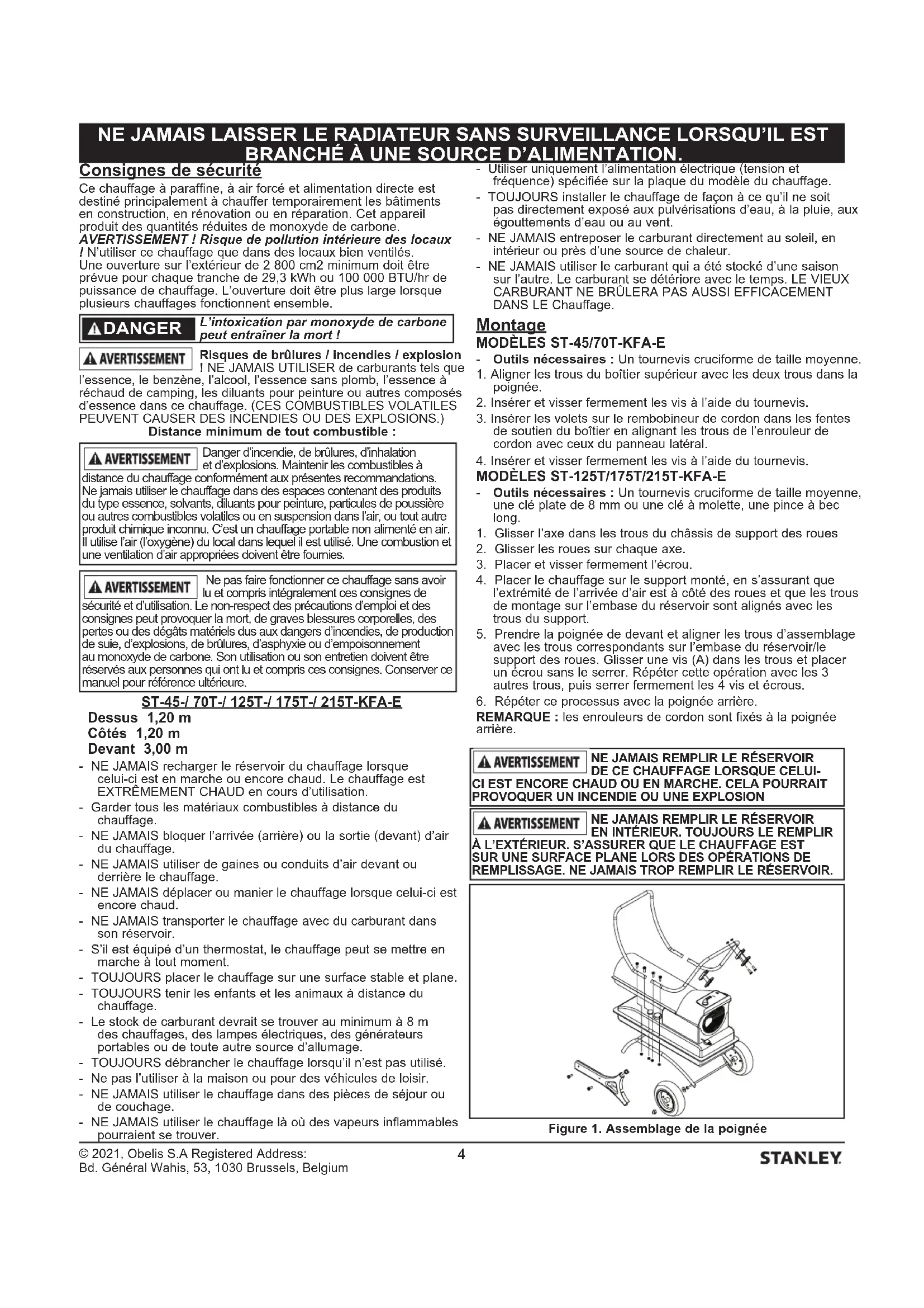 © 2021, Obelis S.A Registered Address: Bd. Général Wahis, 53, 1030 Brussels, Belgium NE JAMAIS LAISSER LE RADIATEUR SANS SURVEILLANCE LORSQU’IL EST BRANCHÉ À UNE SOURCE D’ALIMENTATION. LISTE DES PIÈCES DÉTACHÉES Nº ST-45-KFA-E / ST-70T-KFA-E / ST-125T-KFA-E / ST-175T-KFA-E / ST-215T-KFA-E 1 Réservoir à carburant 2 Bouchon de vidange 3 Jauge de carburant 4 Filtre carburant 5 Bouchon de réservoir de carburant 6 Fil électrique secteur 7 Interrupteur électrique 8 Jauge de carburant électronique 9 Bouton de thermostat 10 Coque inférieure 11 Conduite d’air 12 Capteur température limite 13 Chambre à combustion 14 Fixation cellule photoélectrique 15 Tuyau carburant 16 Cellule photoélectrique 17 Tête de brûleur 18 Gicleurs 19 Bougie d’allumage 20 Moteur 21 Corps de pompe 22 Couvercle de pompe 23 Kit filtres (filtres d’entrée, de sortie et à charpie) 24 Couvre filtre 25 Boulon 26 Kit de réglage de pompe 27 Raccord fileté couvercle de pompe 28 Condensateur 29 Pale du ventilateur 30 Allumeur 31 Couvercle latéral droit 32 Couvercle latéral gauche 33 Protection ventilateur 34 Principale carte de circuit imprimé 35 Fusible 5 A 36 Clip coque 37 Coque supérieure 38 Couvercle en Y droit 39 Couvercle en Y gauche 40 Clip couvercle en Y 41 Jauge de pression d’air 42 Bague du cordon 43 Châssis support de roues (à l’intérieur des couvercles en Y) 44 Poignée arrière 45 Châssis support de roues (pied avant) 46 Axe des roues 47 Roue 48 Écrou de roue 49 Bague de roue 50 Poignée 51 Couvercle supérieur 52 Rembobineur de cordon10 © 2021, Obelis S.A Registered Address: Bd. Général Wahis, 53, 1030 Brussels, Belgium NE JAMAIS LAISSER LE RADIATEUR SANS SURVEILLANCE LORSQU’IL EST BRANCHÉ À UNE SOURCE D’ALIMENTATION.