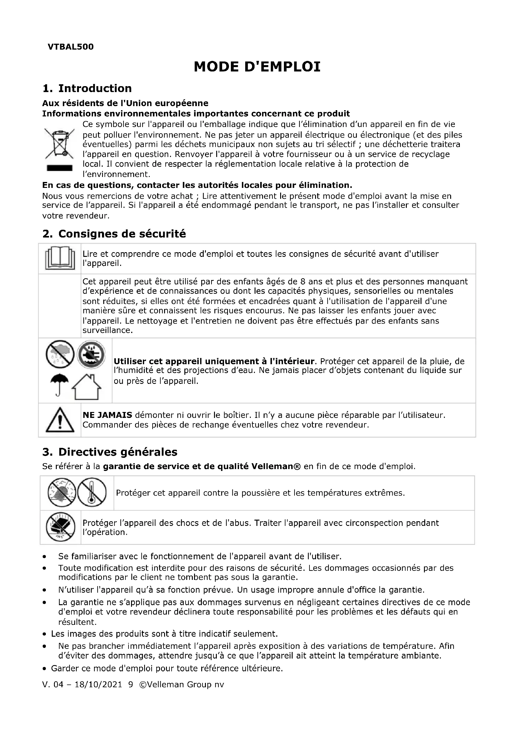 - Garder ce mode d'emploi pour toute référence ultérieure.VTBAL500