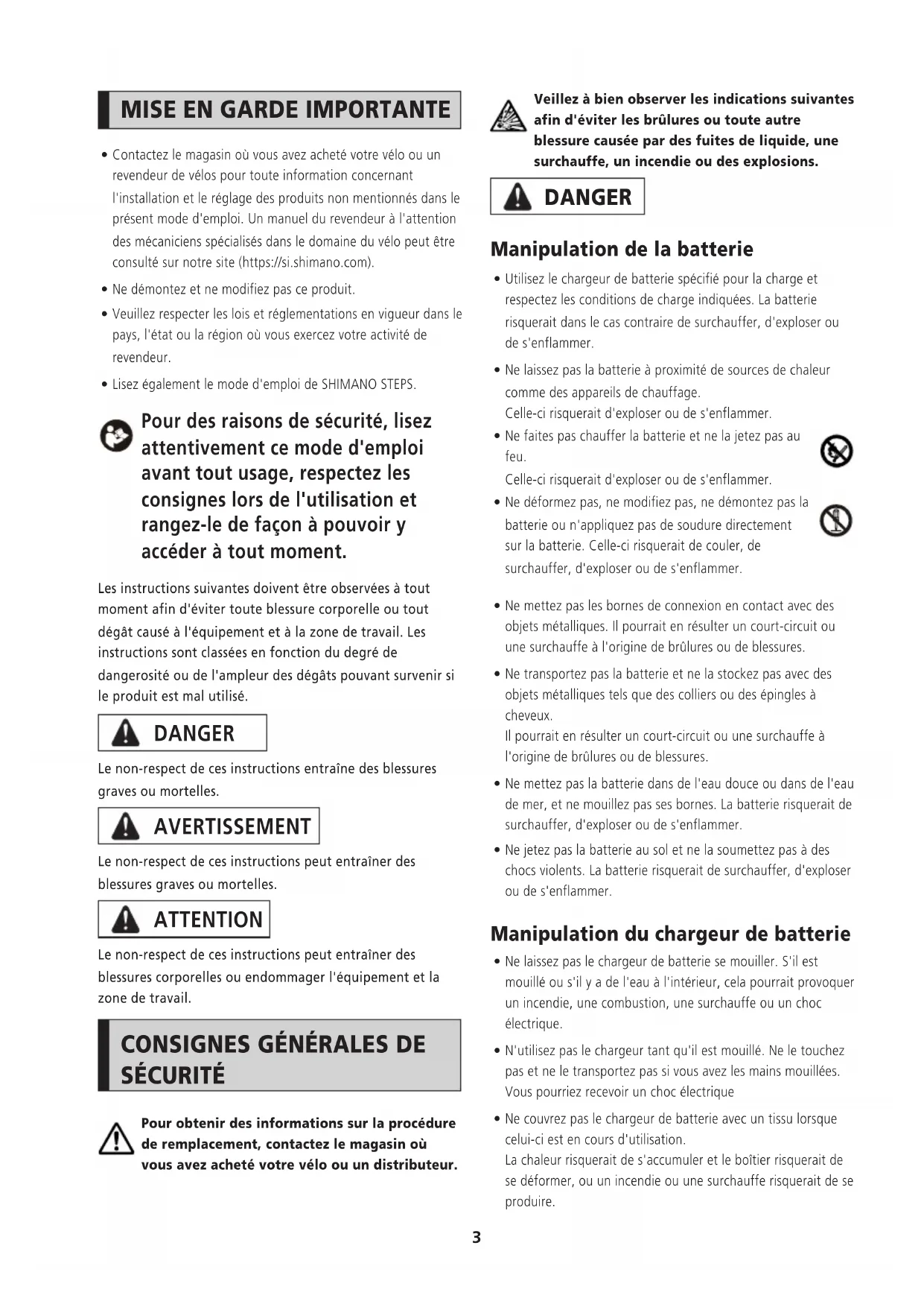 Lisez également le mode d'emploi de SHIMANO STEPS. Pour des raisons de sécurité, lisez attentivement ce mode d'emploi avant tout usage, respectez les consignes lors de l'utilisation et rangez-le de façon à pouvoir y accéder à tout moment. Les instructions suivantes doivent être observées à tout moment afin d'éviter toute blessure corporelle ou tout dégât causé à l'équipement et à la zone de travail. Les instructions sont classées en fonction du degré de dangerosité ou de l'ampleur des dégâts pouvant survenir si le produit est mal utilisé. DANGER Le non-respect de ces instructions entraîne des blessures graves ou mortelles. AVERTISSEMENT Le non-respect de ces instructions peut entraîner des blessures graves ou mortelles. ATTENTION Le non-respect de ces instructions peut entraîner des blessures corporelles ou endommager l'équipement et la zone de travail.
