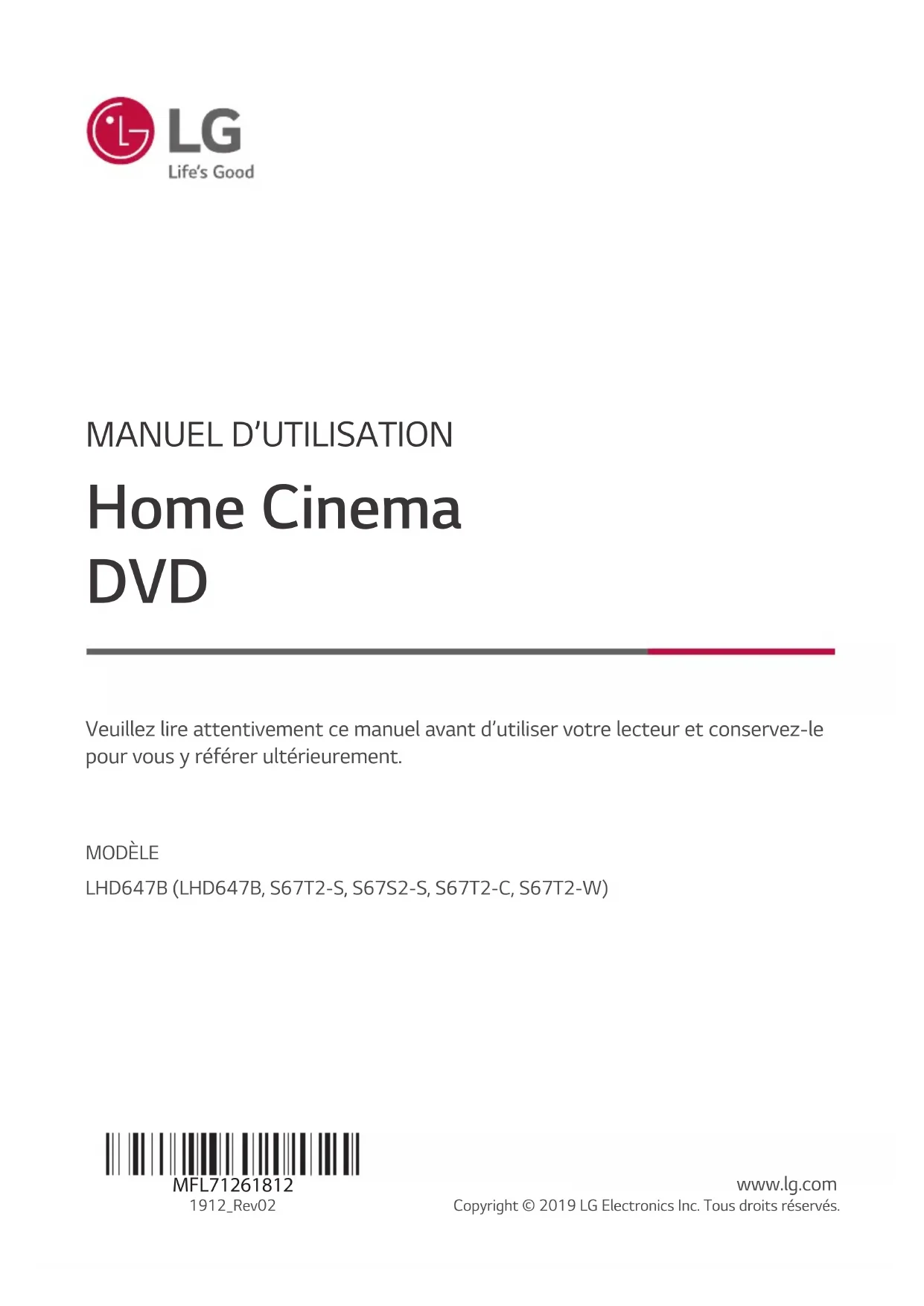 Home Cinema DVD 1912_Rev02 www.lg.com Copyright © 2019 LG Electronics Inc. Tous droits réservés. Veuillez lire attentivement ce manuel avant d’utiliser votre lecteur et conservez-le pour vous y référer ultérieurement. MODÈLE LHD647B (LHD647B, S67T2-S, S67S2-S, S67T2-C, S67T2-W) MFL712618121 Démarrage Démarrage2 Démarrage