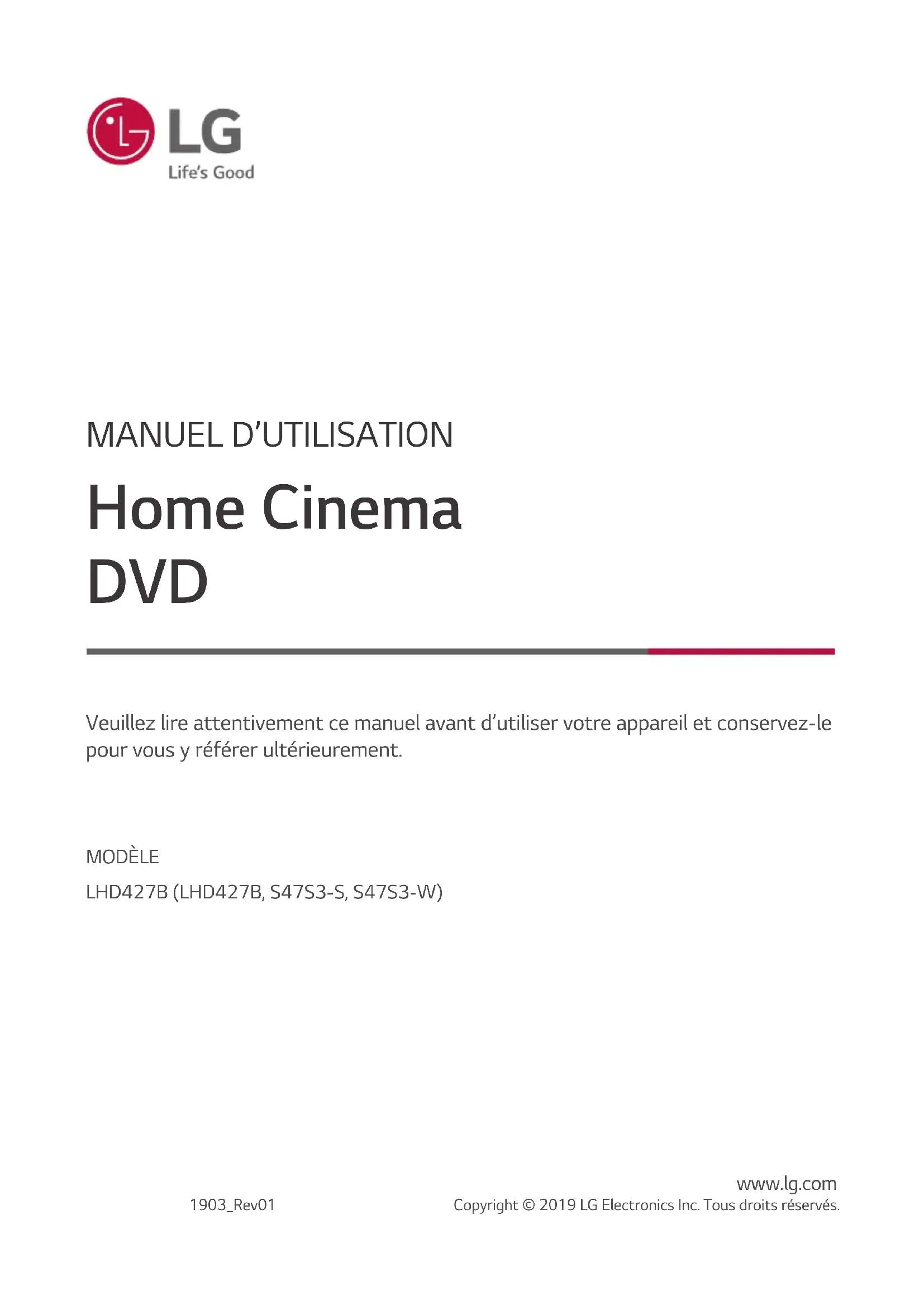 Home Cinema DVD Veuillez lire attentivement ce manuel avant d’utiliser votre appareil et conservez-le pour vous y référer ultérieurement. MODÈLE LHD427B (LHD427B, S47S3-S, S47S3-W) 1903_Rev01 www.lg.com Copyright © 2019 LG Electronics Inc. Tous droits réservés.1 Démarrage Démarrage2 Démarrage