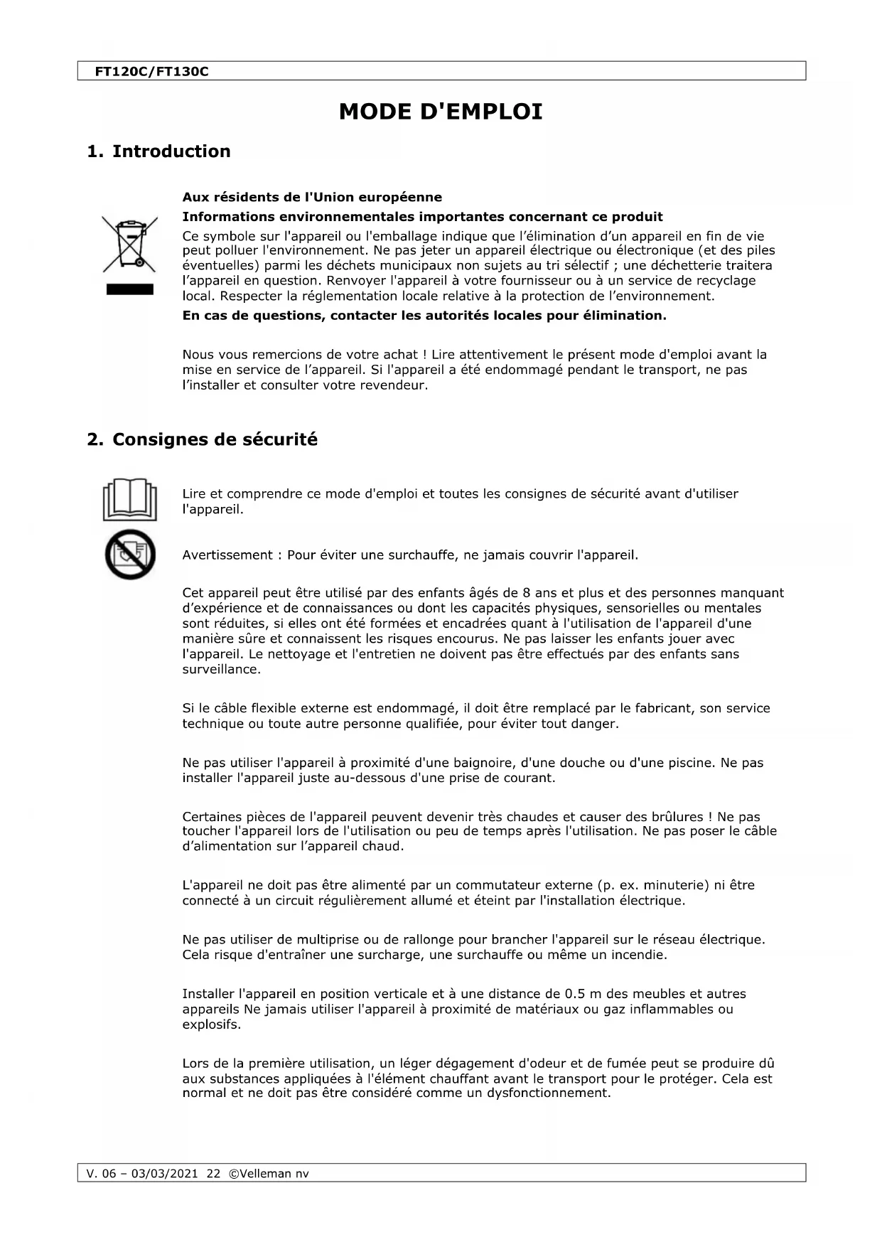 Velleman SA est l’ayant droit des droits d’auteur de ce mode d'emploi. Tous droits mondiaux réservés. Toute reproduction, traduction, copie ou diffusion, intégrale ou partielle, du contenu de ce mode d'emploi par quelque procédé ou sur tout support électronique que ce soit est interdite sans l’accord préalable écrit de l’ayant droit.FT120C/FT130C