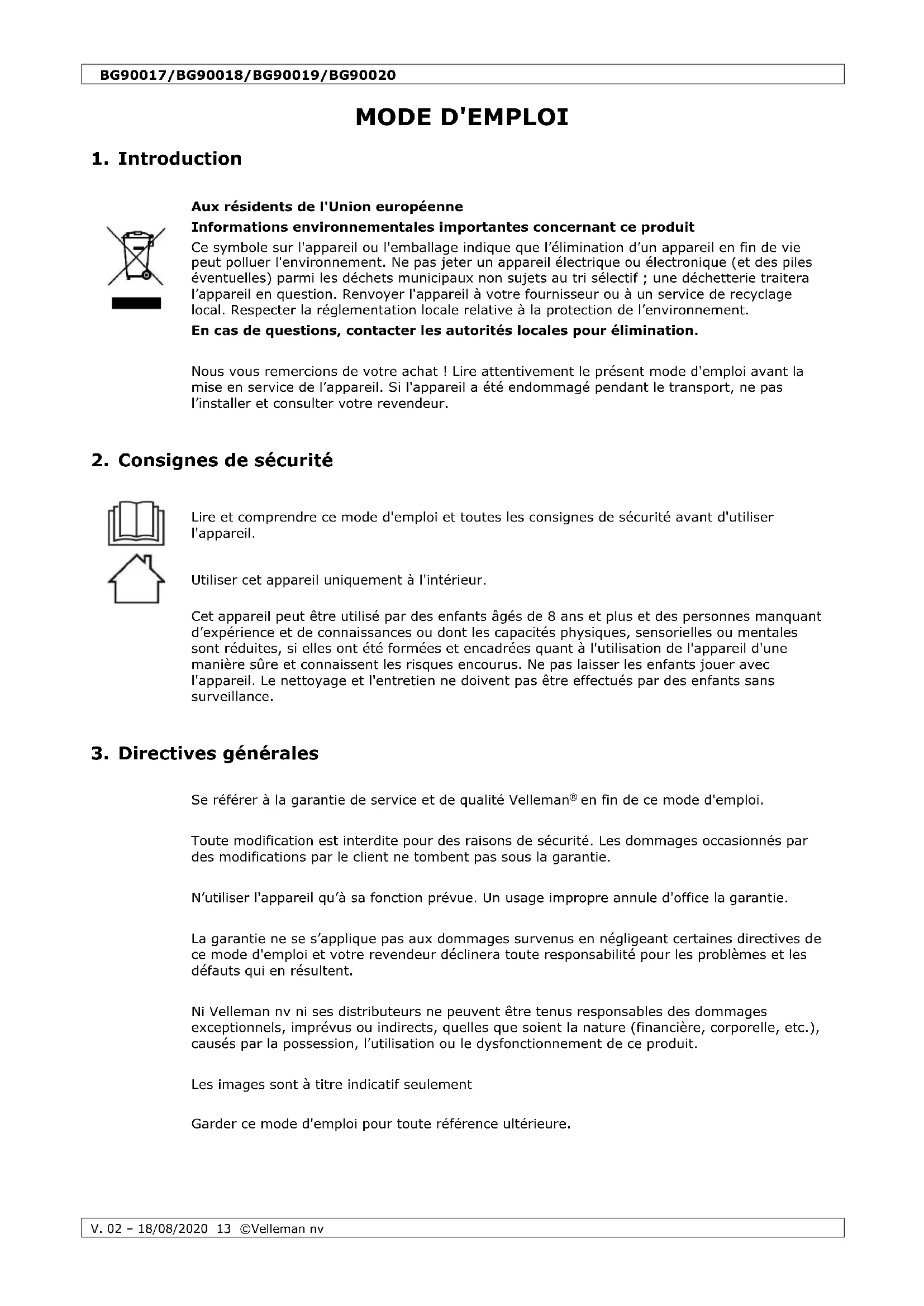 Velleman SA est l’ayant droit des droits d’auteur de ce mode d'emploi. Tous droits mondiaux réservés. Toute reproduction, traduction, copie ou diffusion, intégrale ou partielle, du contenu de ce mode d'emploi par quelque procédé ou sur tout support électronique que ce soit est interdite sans l’accord préalable écrit de l’ayant droit.BG90017/BG90018/BG90019/BG90020