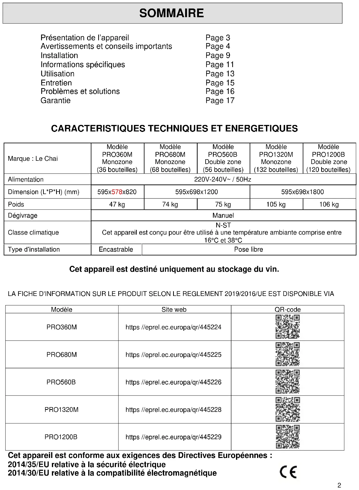 PRO360M : 36 bouteilles PRO680M : 68 bouteilles PRO560B : 56 bouteilles PRO1320M : 132 bouteilles PRO1200B : 120 bouteilles2 SOMMAIRE