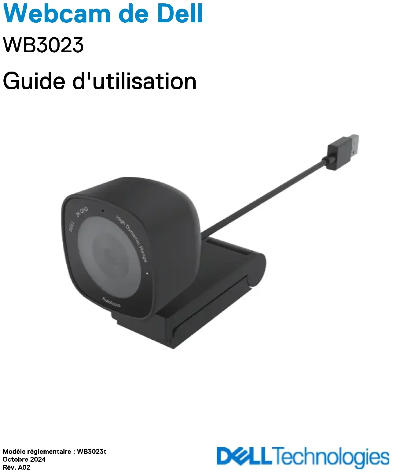 Modèle réglementaire : WB3023t Octobre 2024 Rév. A02 Webcam de Dell WB3023 Guide d'utilisation© 2023-2024 Dell Inc. ou ses filiales. Tous droits réservés. Dell, EMC et les autres marques commerciales sont des marques commerciales de Dell Inc. ou de ses filiales. Les autres marques peuvent être des marques commerciales de leurs propriétaires respectifs. REMARQUE : Une REMARQUE indique des informations importantes qui vous aident à mieux utiliser votre ordinateur.
