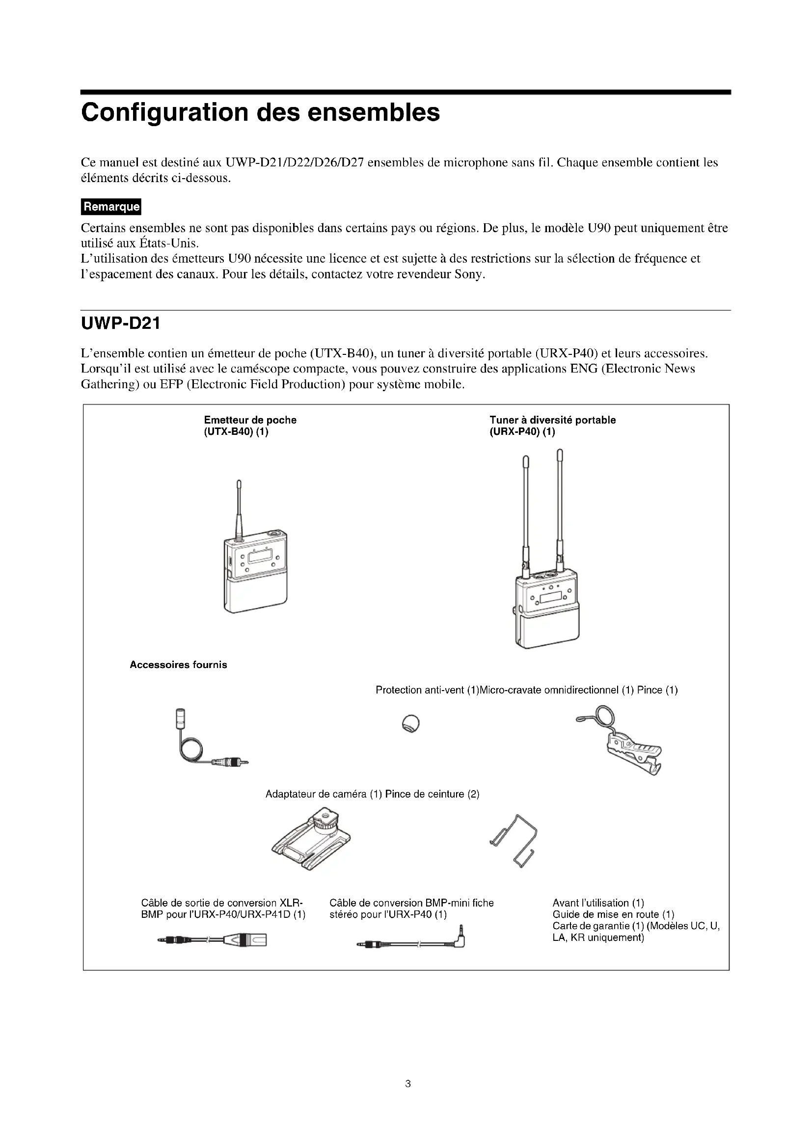 - Tuner (URX-P40/P41D) Configuration des ensembles Ce manuel est destiné aux UWP-D21/D22/D26/D27 ensembles de microphone sans fil. Chaque ensemble contient les éléments décrits ci-dessous. Certains ensembles ne sont pas disponibles dans certains pays ou régions. De plus, le modèle U90 peut uniquement être p. 593