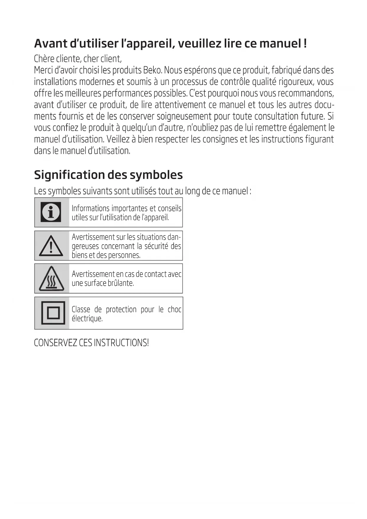 - Evidence of dropping or abuse. c. Before turning on microwave power for any service test or inspection within the microwave generating compartments, check the magnetron, wave guide or transmission line, and cavity for proper alignment, integrity,and connection. d. Any defective or misadjusted components in the interlock, monitor, door seal, and microwave generation and transmission systems shall be repaired, replaced, or adjusted by procedures described in this manual before the oven is released to the owner. e. A microwave leakage check to verify compliance with the Federal Performance Standard should be performed on each oven prior to release to the owner.Avant d'utiliser l'appareil, veuillez lire ce manuel ! Chère cliente, cher client, Merci d’avoir choisi les produits Beko. Nous espérons que ce produit, fabriqué dans des installations modernes et soumis à un processus de contrôle qualité rigoureux, vous offre les meilleures performances possibles. C’est pourquoi nous vous recommandons, avant d’utiliser ce produit, de lire attentivement ce manuel et tous les autres docu- ments fournis et de les conserver soigneusement pour toute consultation future. Si vous confiez le produit à quelqu’un d’autre, n’oubliez pas de lui remettre également le manuel d’utilisation. Veillez à bien respecter les consignes et les instructions figurant dans le manuel d’utilisation. Signification des symboles Les symboles suivants sont utilisés tout au long de ce manuel :