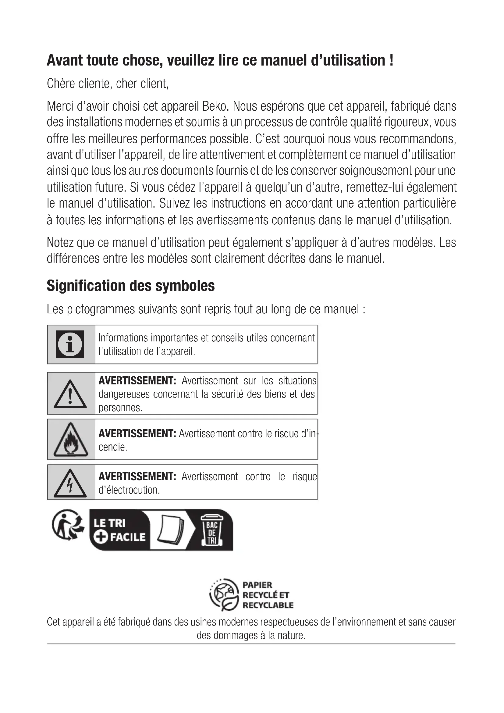 GarantiebedingungenAvant toute chose, veuillez lire ce manuel d’utilisation! Chère cliente, cher client, Merci d’avoir choisi cet appareil Beko. Nous espérons que cet appareil, fabriqué dans des installations modernes et soumis à un processus de contrôle qualité rigoureux, vous offre les meilleures performances possible. C’est pourquoi nous vous recommandons, avant d’utiliser l’appareil, de lire attentivement et complètement ce manuel d’utilisation ainsi que tous les autres documents fournis et de les conserver soigneusement pour une utilisation future. Si vous cédez l’appareil à quelqu’un d’autre, remettez-lui également le manuel d’utilisation. Suivez les instructions en accordant une attention particulière à toutes les informations et les avertissements contenus dans le manuel d’utilisation. Notez que ce manuel d’utilisation peut également s’appliquer à d’autres modèles. Les différences entre les modèles sont clairement décrites dans le manuel. Signification des symboles Les pictogrammes suivants sont repris tout au long de ce manuel: