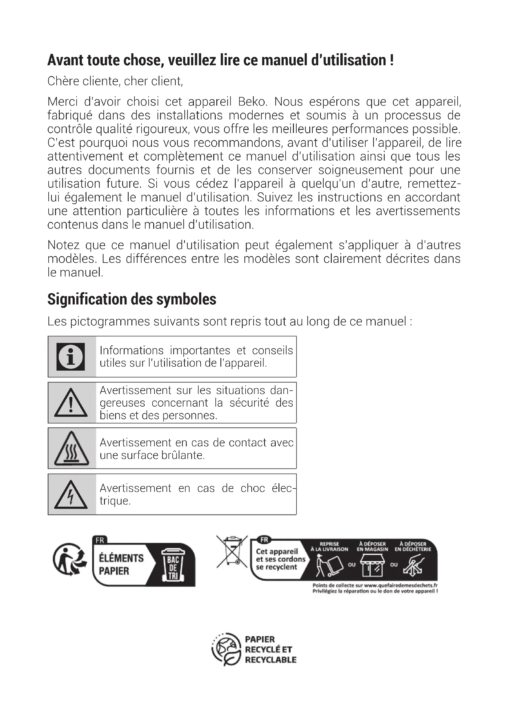 the oven is dirty. Refer to “Cleaning and Main- tenance" section to clean dirty parts.Avant toute chose, veuillez lire ce manuel d’utilisation ! Chère cliente, cher client, Merci d’avoir choisi cet appareil Beko. Nous espérons que cet appareil, fabriqué dans des installations modernes et soumis à un processus de contrôle qualité rigoureux, vous offre les meilleures performances possible. C’est pourquoi nous vous recommandons, avant d’utiliser l’appareil, de lire attentivement et complètement ce manuel d’utilisation ainsi que tous les autres documents fournis et de les conserver soigneusement pour une utilisation future. Si vous cédez l’appareil à quelqu’un d’autre, remettez- lui également le manuel d’utilisation. Suivez les instructions en accordant une attention particulière à toutes les informations et les avertissements contenus dans le manuel d’utilisation. Notez que ce manuel d’utilisation peut également s’appliquer à d’autres modèles. Les différences entre les modèles sont clairement décrites dans le manuel. Signification des symboles Les pictogrammes suivants sont repris tout au long de ce manuel :