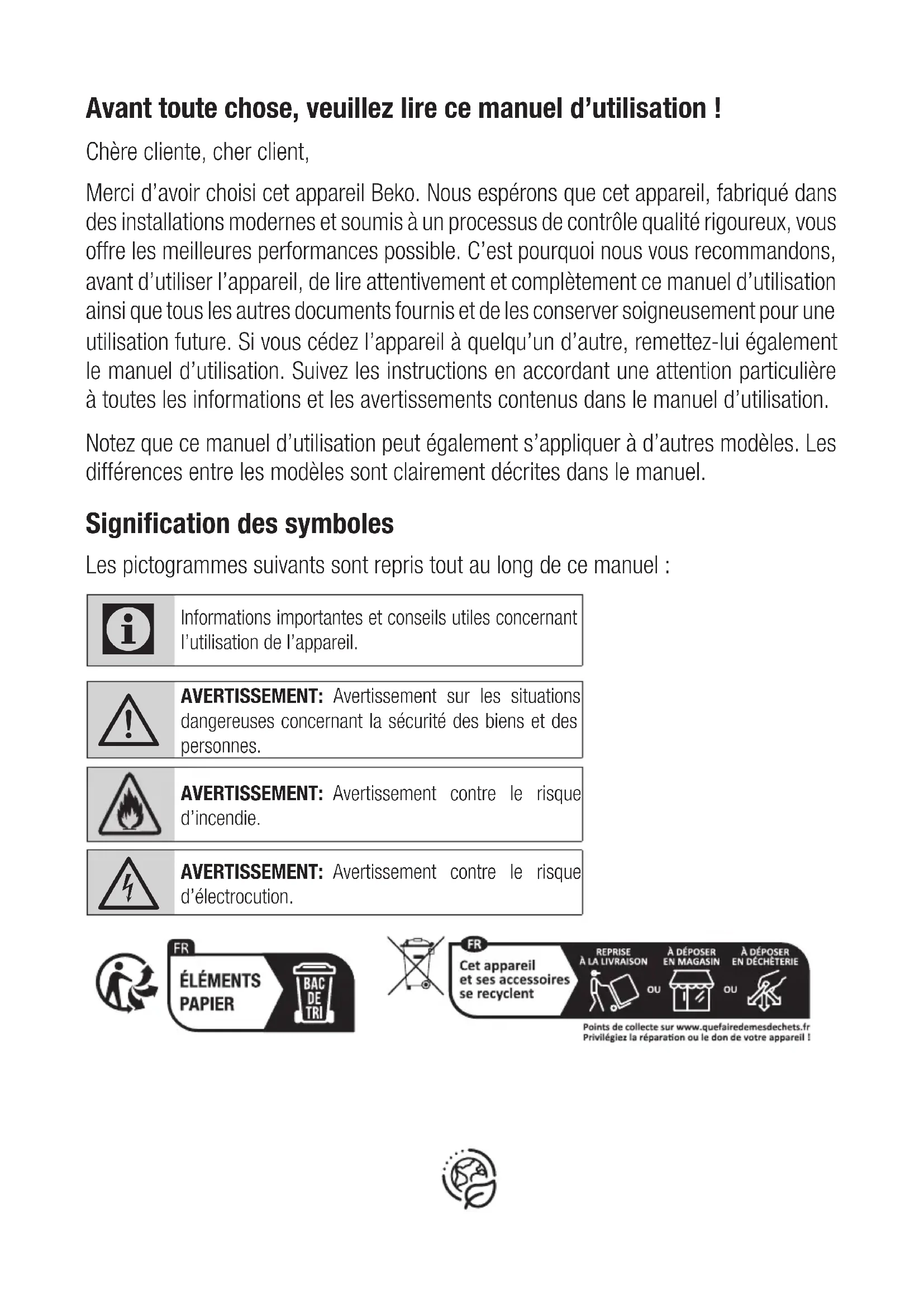 Garantiebedingungen Beko Grundig Deutschland GmbH Rahmannstraße 3 65760 EschbornAvant toute chose, veuillez lire ce manuel d’utilisation ! Chère cliente, cher client, Merci d’avoir choisi cet appareil Beko. Nous espérons que cet appareil, fabriqué dans des installations modernes et soumis à un processus de contrôle qualité rigoureux, vous offre les meilleures performances possible. C’est pourquoi nous vous recommandons, avant d’utiliser l’appareil, de lire attentivement et complètement ce manuel d’utilisation ainsi que tous les autres documents fournis et de les conserver soigneusement pour une utilisation future. Si vous cédez l’appareil à quelqu’un d’autre, remettez-lui également le manuel d’utilisation. Suivez les instructions en accordant une attention particulière à toutes les informations et les avertissements contenus dans le manuel d’utilisation. Notez que ce manuel d’utilisation peut également s’appliquer à d’autres modèles. Les différences entre les modèles sont clairement décrites dans le manuel. Signification des symboles Les pictogrammes suivants sont repris tout au long de ce manuel :