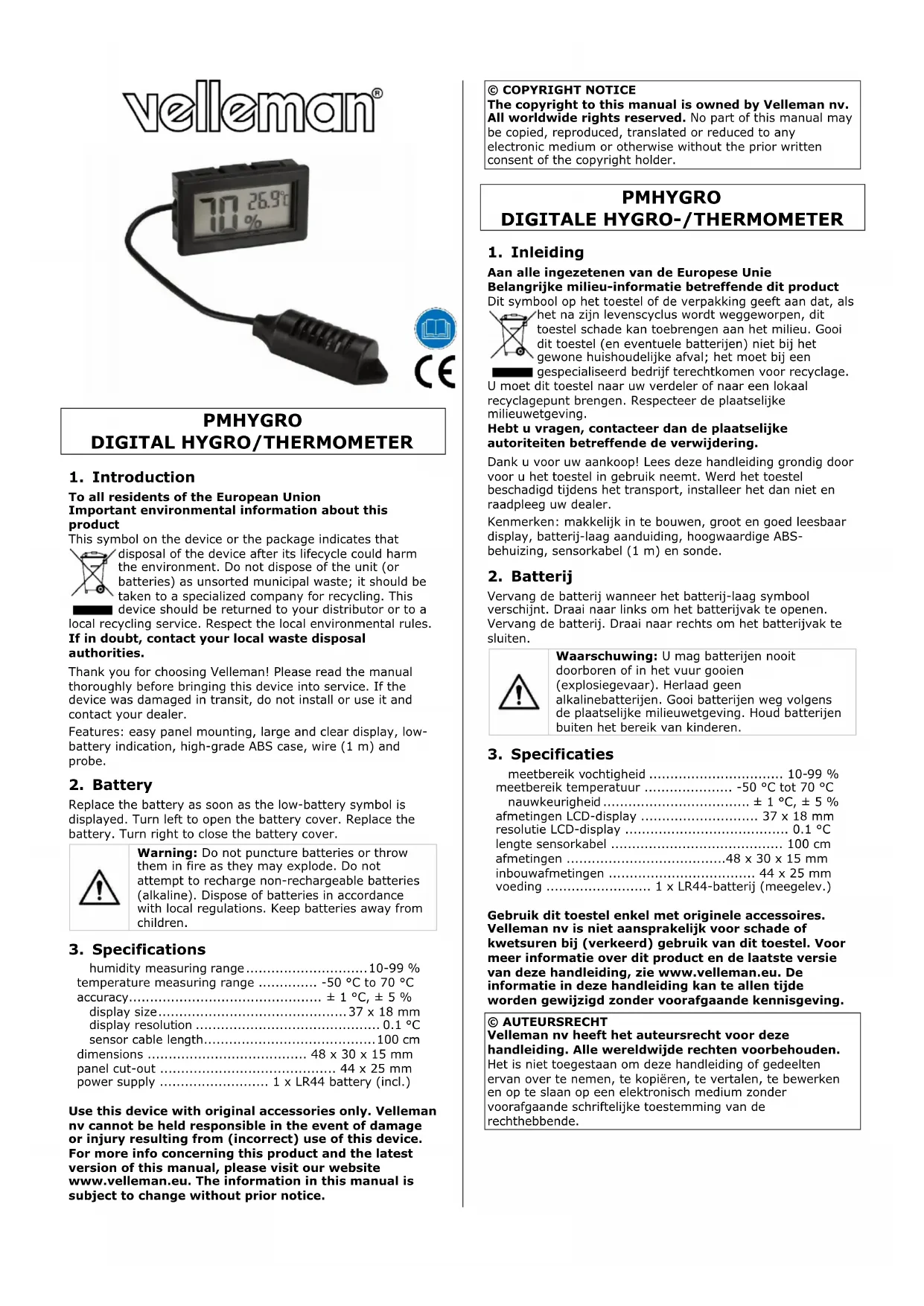 PMHYGRO - Thermomètre VELLEMAN - Notice d'utilisation et mode d'emploi gratuit
