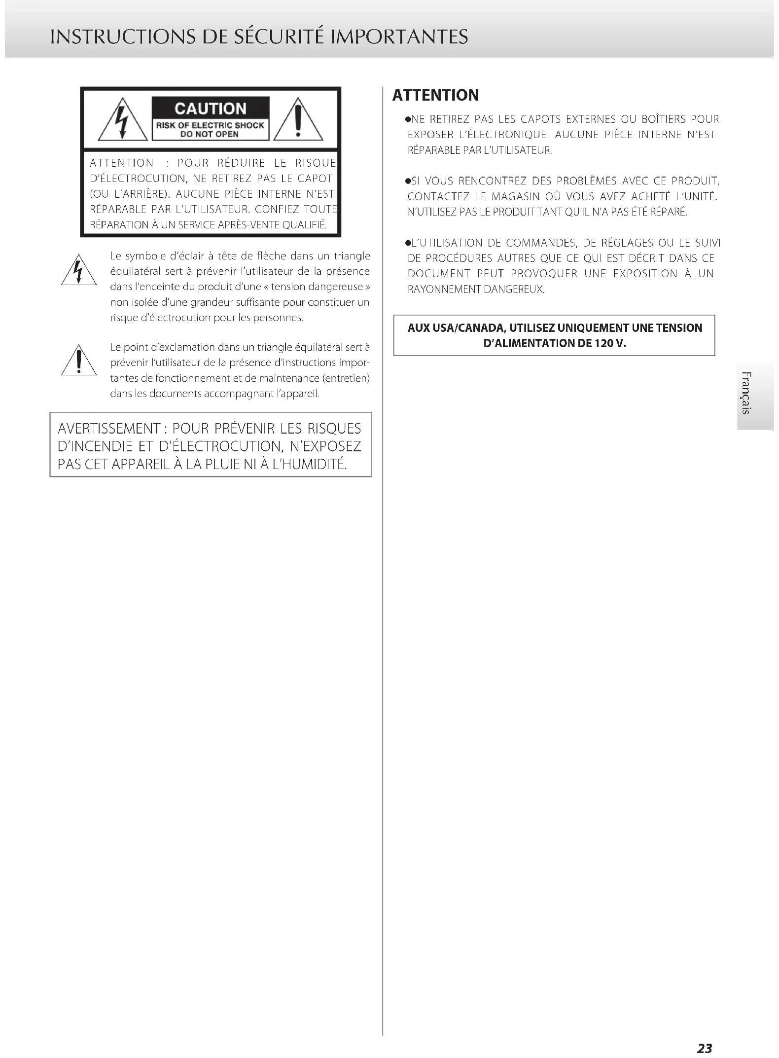 ATTENTION : POUR RÉDUIRE LE RISQUE D’ÉLECTROCUTION, NE RETIREZ PAS LE CAPOT (OU L’ARRIÈRE). AUCUNE PIÈCE INTERNE N’EST RÉPARABLE PAR L’UTILISATEUR. CONFIEZ TOUTE RÉPARATION À UN SERVICE APRÈS-VENTE QUALIFIÉ. Le symbole d’éclair à tête de flèche dans un triangle équilatéral sert à prévenir l’utilisateur de la présence dans l’enceinte du produit d’une «tension dangereuse» non isolée d’une grandeur suffisante pour constituer un risque d’électrocution pour les personnes. Le point d’exclamation dans un triangle équilatéral sert à prévenir l’utilisateur de la présence d’instructions impor-tantes de fonctionnement et de maintenance (entretien) dans les documents accompagnant l’appareil.