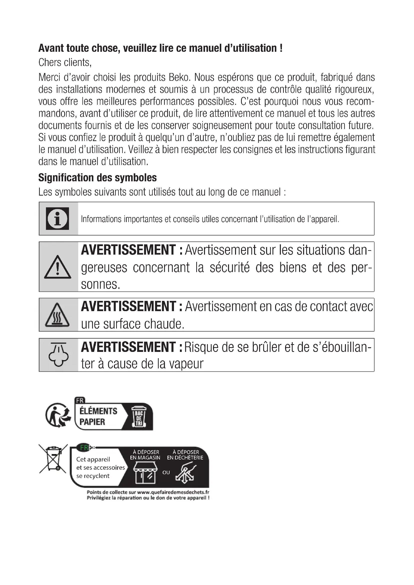 Beko Germany GmbH, Rahmannstrasse 3, 65760 EschbornAvant toute chose, veuillez lire ce manuel d’utilisation ! Chers clients, Merci d’avoir choisi les produits Beko. Nous espérons que ce produit, fabriqué dans des installations modernes et soumis à un processus de contrôle qualité rigoureux, vous offre les meilleures performances possibles. C’est pourquoi nous vous recom- mandons, avant d’utiliser ce produit, de lire attentivement ce manuel et tous les autres documents fournis et de les conserver soigneusement pour toute consultation future. Si vous confiez le produit à quelqu’un d’autre, n’oubliez pas de lui remettre également le manuel d’utilisation. Veillez à bien respecter les consignes et les instructions figurant dans le manuel d’utilisation. Signification des symboles Les symboles suivants sont utilisés tout au long de ce manuel :