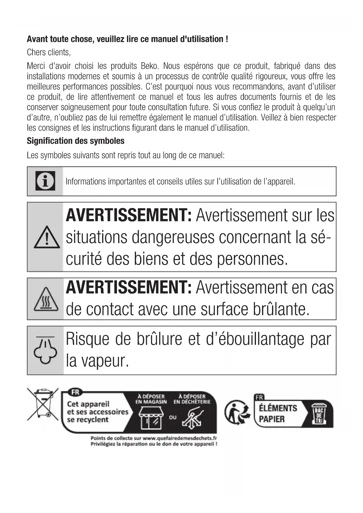 Beko Germany GmbH, Rahmannstrasse 3, 65760 EschbornAvant toute chose, veuillez lire ce manuel d'utilisation ! Chers clients, Merci d'avoir choisi les produits Beko. Nous espérons que ce produit, fabriqué dans des installations modernes et soumis à un processus de contrôle qualité rigoureux, vous offre les meilleures performances possibles. C’est pourquoi nous vous recommandons, avant d’utiliser ce produit, de lire attentivement ce manuel et tous les autres documents fournis et de les conserver soigneusement pour toute consultation future. Si vous confiez le produit à quelqu’un d’autre, n’oubliez pas de lui remettre également le manuel d’utilisation. Veillez à bien respecter les consignes et les instructions figurant dans le manuel d’utilisation. Signification des symboles Les symboles suivants sont repris tout au long de ce manuel: