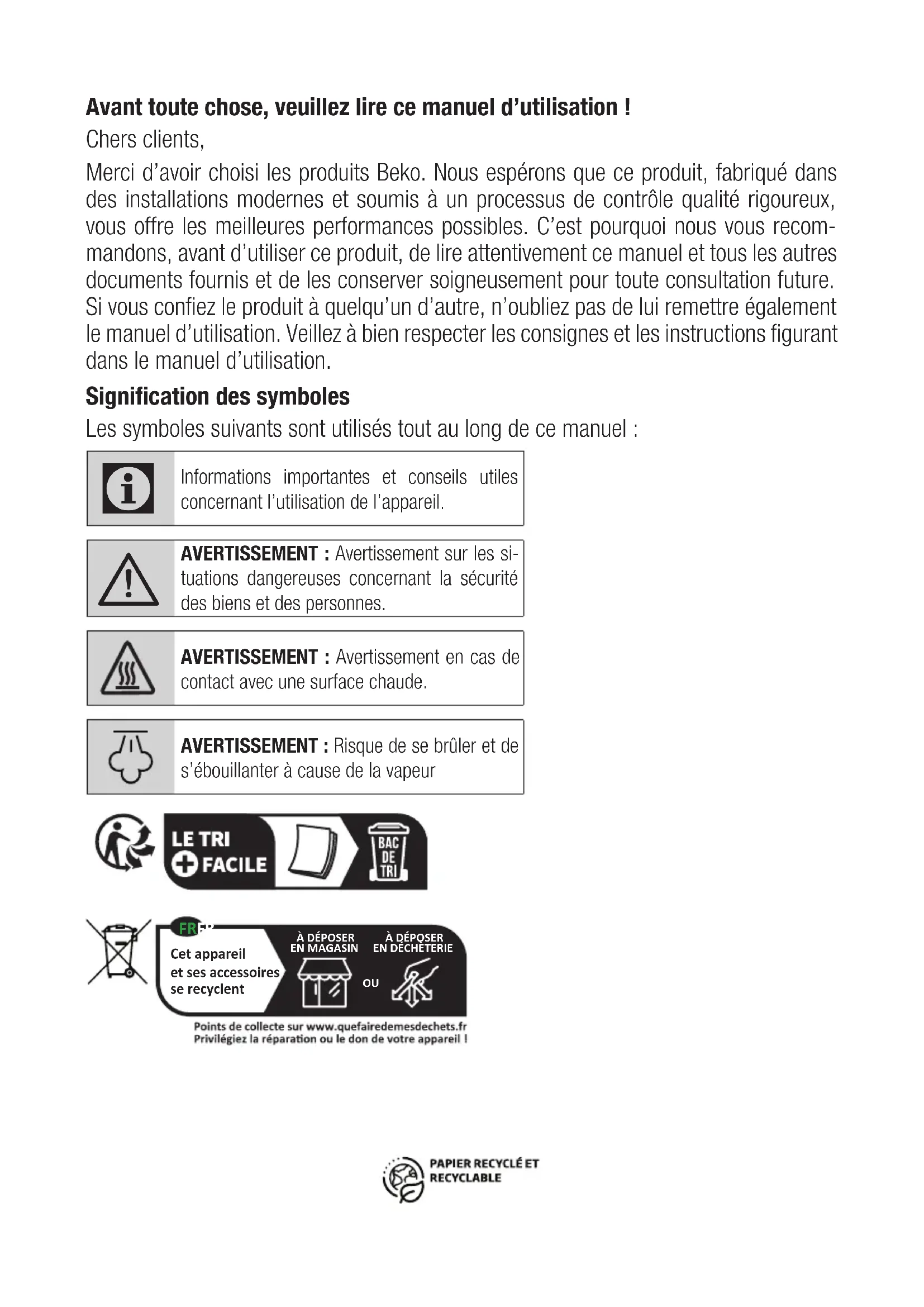 Diese Garantiezusage ist nur gültig innerhalb der Bundesrepublik Deutschland Garantiebedingungen - Beko – Version Februar 2021Avant toute chose, veuillez lire ce manuel d’utilisation ! Chers clients, Merci d’avoir choisi les produits Beko. Nous espérons que ce produit, fabriqué dans des installations modernes et soumis à un processus de contrôle qualité rigoureux, vous offre les meilleures performances possibles. C’est pourquoi nous vous recom- mandons, avant d’utiliser ce produit, de lire attentivement ce manuel et tous les autres documents fournis et de les conserver soigneusement pour toute consultation future. Si vous confiez le produit à quelqu’un d’autre, n’oubliez pas de lui remettre également le manuel d’utilisation. Veillez à bien respecter les consignes et les instructions figurant dans le manuel d’utilisation. Signification des symboles Les symboles suivants sont utilisés tout au long de ce manuel :