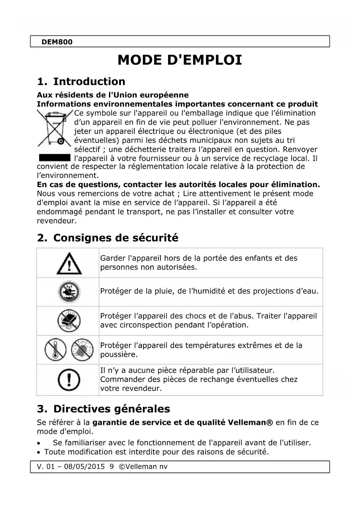 Se référer à la garantie de service et de qualité Velleman® en fin de ce mode d'emploi. Se familiariser avec le fonctionnement de l'appareil avant de l'utiliser. Toute modification est interdite pour des raisons de sécurité.DEM800
